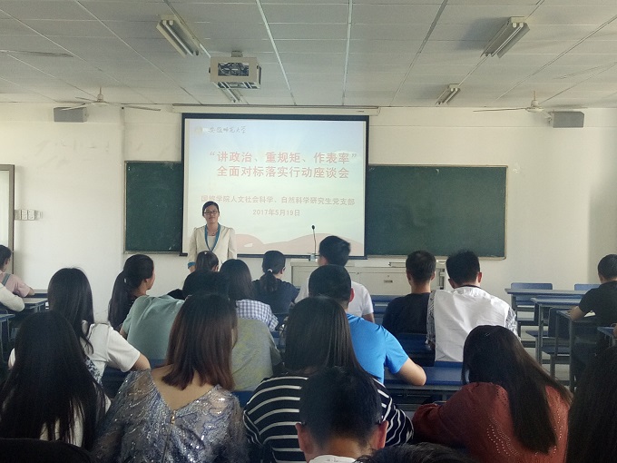 5月19日下午,国旅学院人文社会科学研究生党支部与自然科学研究生党支部在学院实验楼202共同召开“讲政治、重规矩、作表率” 全面对标落实行动座谈会。会议由党支部书记施华转、从然共同主持。