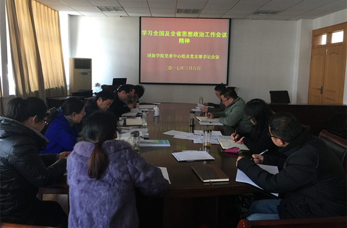 3月6日,国旅学院召开党委中心组(扩大)学习会议,深入贯彻落实全国、全省思想政治工作会议精神,党委中心组成员及各支部书记参加了此次学习会。学院党委书记贾冠忠主持会议并传达了全国、全省思想政治工作会议精神, 党委副书记乔静作了专题发言,随后,中心组成员及各支部书记进行了研讨。