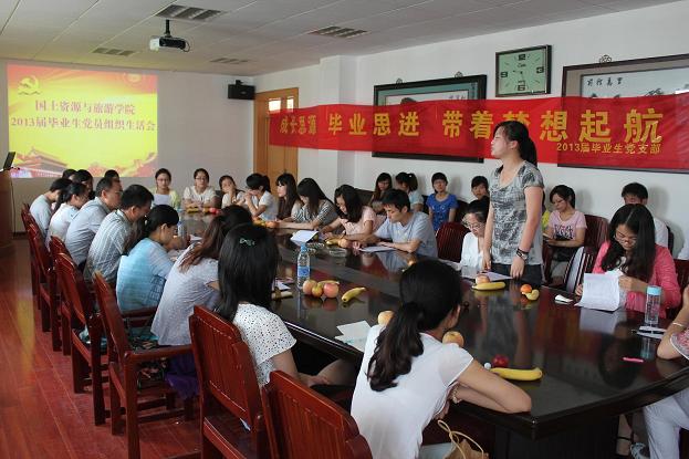 为了做好2013届毕业生文明离校工作,充分发挥毕业生党员的先锋模范作用,6月14日上午,国土资源与旅游学院在院行政楼三楼会议室举行了以“成长思源,毕业思进,带着梦想起航”为主题的2013届毕业生党员组织生活会。学院党委副书记罗振、毕业班辅导员朱永恒、洪娟、徐玉婷和各专业支部书记及2013届毕业生党员代表参加本次活动。