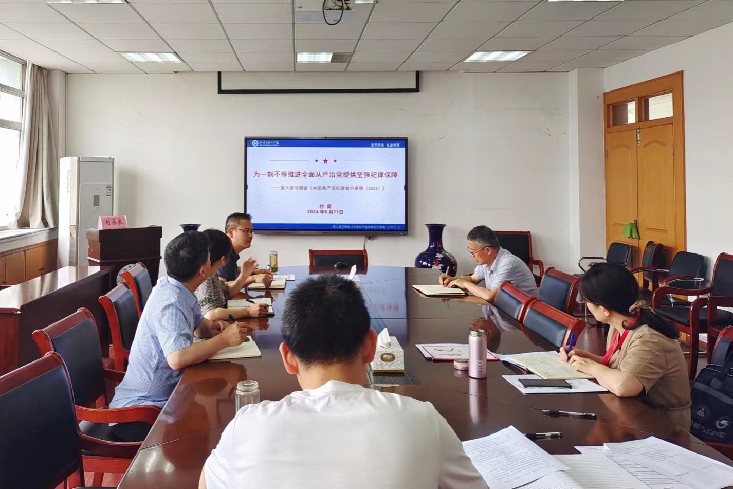 会议分为视频学习、集中学习和专题研讨三个阶段。第一阶段,观看警示教育片《永远吹冲锋号》第四集《永远在路上》,该片生动讲述新的历史条件下,中国共产党持之以恒推进全面从严治党,以党的自我革命引领社会革命的故事。第二阶段方凤满同志领学了《求是》杂志发表的习近平总书记重要文章《必须坚持人民至上》,贾冠忠同志领学了习近平总书记对学校思政课建设作出的重要指示精神,付勇同志作《条例》解读专题报告。第三阶段,与会成员开展研讨,曹卫东从“增强政治自觉深入学”“牢记使命身份踏实干”“时刻谨慎用权守底线”三个方面阐述如何做到“学党纪、明规矩、强党性”;汪文文指出要从违法违纪案件中汲取经验教训,要老老实实做人,清清白白做事,要对照党章党规党纪,守住拒腐防变的思想防线,自觉把“为师生服务”的宗旨贯穿工作始终,锲而不舍地做好服务师生的每一件小事。
