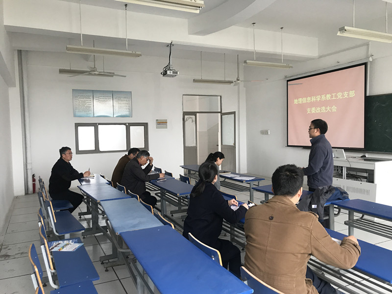 3月27日, 地理信息科学系教工党支部在实验楼201教室召开支委改选大会。支部党员出席大会,大会由原党支部书记汪左主持。