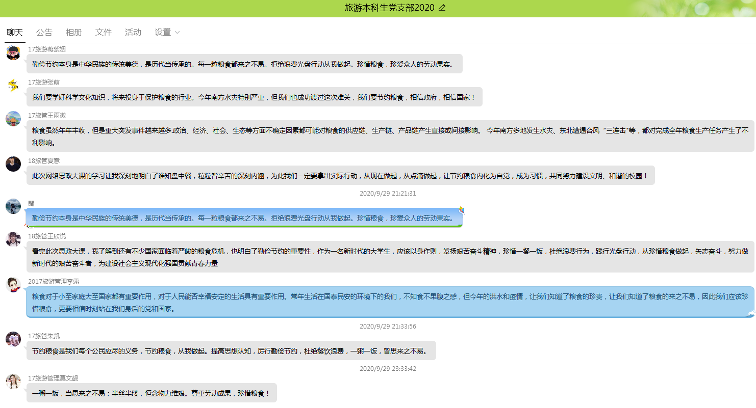 旅游本科生党支部入党积极分子、2017级旅游管理本科生 李露:粮食对于小至家庭大至国家都有重要作用,对于人民能否幸福安定的生活具有重要作用。常年生活在国泰民安的环境下的我们,不知食不果腹之感,但今年的洪水和疫情,让我们知道了粮食的珍贵,让我们知道了粮食的来之不易,因此我们应该珍惜粮食,更要相信时刻站在我们身后的党和国家。
