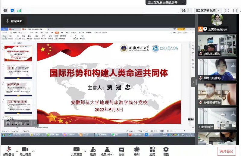 贾冠忠向同学们介绍了2021年国际形势,他用动荡变革,负重前行来概括,具体体现在:世界经济持续复苏但不稳定不平衡、大国博弈更趋激烈、地区热点与地缘冲突不断、传统与非传统安全问题频发等四个方面。课上,他详细分析了2022年当前国际形势,世界变局纵深发展、危机并存;世界经济增长面临下行风险、大国战略竞争升级,俄乌冲突成为热点。同时对中国外交进行展望,积极构建人类命运共同体。当今世界面领着百年未有之大变局,政治多极化、经济全球化、文化多样化和社会信息化潮流不可逆转,各国间的联系和依存日益加深,但也面临诸多共同挑战。
