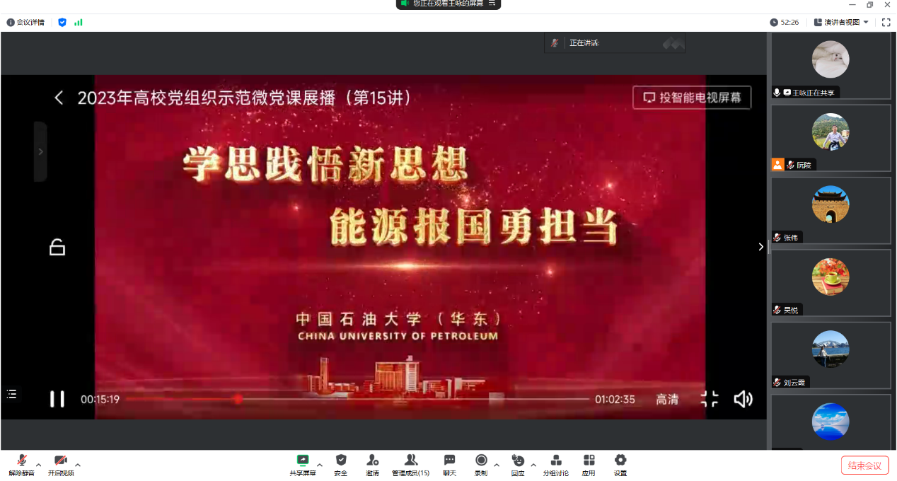 根据《中共安徽省委教育工委转发教育部思想政治工作司关于做好2023年高校党组织示范微党课学习收看组织工作的通知》的通知要求,旅游酒店系教工党支部从 6 月中旬开始要求党员线上自学课程。本次集体收看的是第十五讲,由全国优秀党务工作者、中国石油大学(华东)党委常委、组织部部长张卫东主讲的《学实践悟新思想 能源报国有担当》课程。