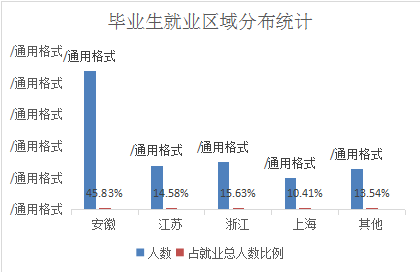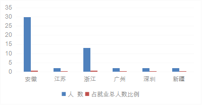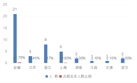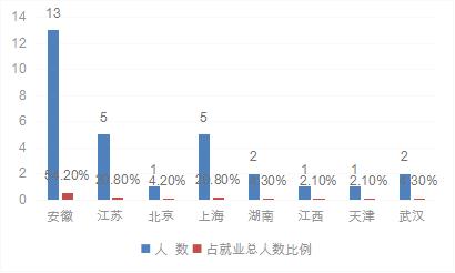 2018年,从旅游管理专业签约单位地域分布来看,选择在安徽工作的毕业生人数为44人,占签约就业毕业生人数的45.83%。在省外签约就业人数为52人,占签约就业毕业生人数的54.17%,具体毕业生就业区域分布详见图10: