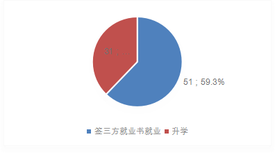 2018年,地理科学专业毕业生就业率达95.34%,考研率高达36.04%。其中签约就业51人,占毕业人数的59.3%,升学31人,占毕业人数的36.04%。2018年地理科学专业具体毕业生就业去向比例构成详见图1: