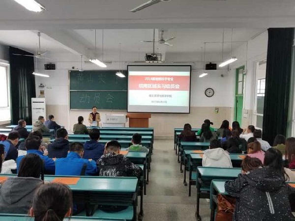 动员大会上,方凤满从实习目的、实习计划、实习意义等方面强调了皖南地区实习的重要性,要求学生强化“学习意识,吃苦意识,团队意识”,遵守“严于律己,服从管理,安全第一”的实习原则,希望全体实习学生在实习过程中能做到“多观察、多提问、多走路、多思考、多记笔记、多总结”,能够学到知识。乔静则强调学生遵守实习纪律,重视“安全意识、纪律意识、形象意识”。随后专业任课教师胡春生和赵春雨分别做了自然和人文实习专场报告会,详细介绍了解黄山地区的地质地貌等自然地理特征,以及徽州古村落、人居环境、旅游发展等人文地理内容。