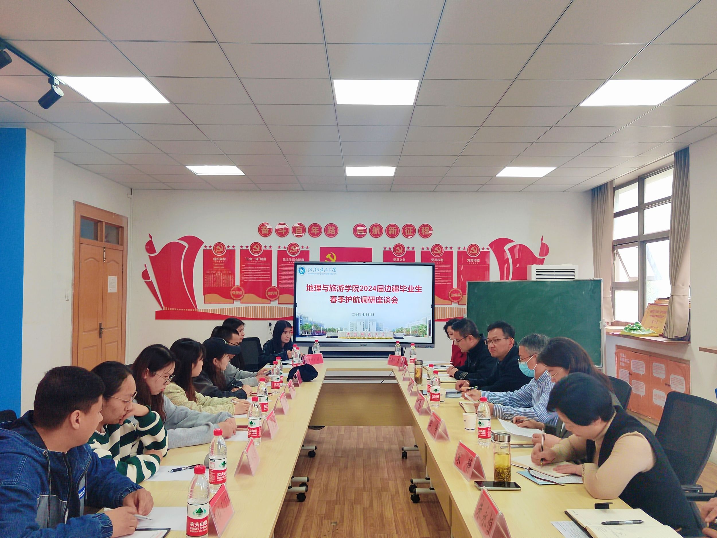 在学院二楼学生活动室召开2024届边疆毕业生春季护航调研座谈会,学校新疆内派教师李争、学生工作处副处长宋静、招生就业处副处长刘振杰、学院党委书记贾冠忠、党委副书记付勇、地理科学(师范)专业负责人朱永恒、2024届毕业班辅导员和2024届边疆毕业生参加,会议由付勇主持。