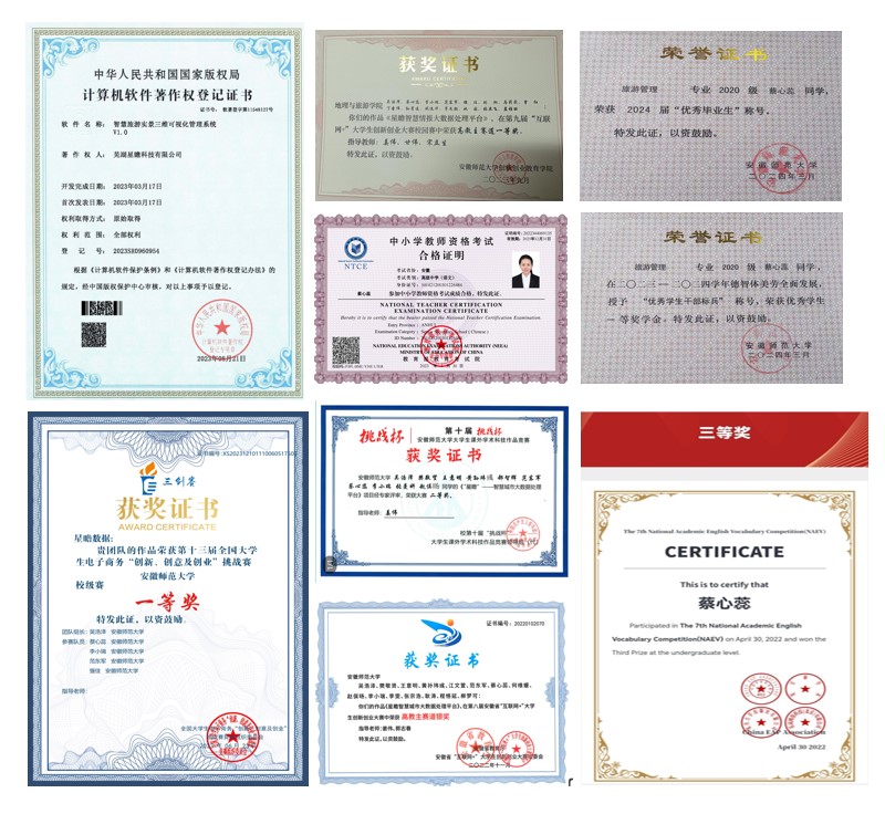 学生代表大会等校级重大会场的布置16次,统筹负责全校大型志愿服务活动10余次,服务全校师生上万名。作为班委,将班级建设融入校、院学生会特色活动中,并代表班级参加校级十佳班集体汇报,代表学院参加全国高校学生会组织“我为同学做实事”项目交流展示活动,项目从全国1700多个高校,3581个项目中脱颖而出,获全国仅100个的“精品项目”称号,代表专业主持2023年《旅游学刊》中国旅游研究年会。在芜湖市星瞻科技有限公司实习工作期间,任公司运营组组长,负责公司微信公众号的运营管理,公司获芜湖市大学生创新创业50万基金资助。在校团委组织部实习锻炼期间,统筹负责全校智慧团建、西部计划、青耘计划、志愿服务、青马工程以及“花津大讲堂-院士师范院校行”等多项团学工作,累计组织校级活动十余场。坚信事事有回音,事事放心上。学生工作的经历让她更好融入同学之中,以自己力所能及的行动为同学们提供更好的服务,让努力之花盛开在师大校园。