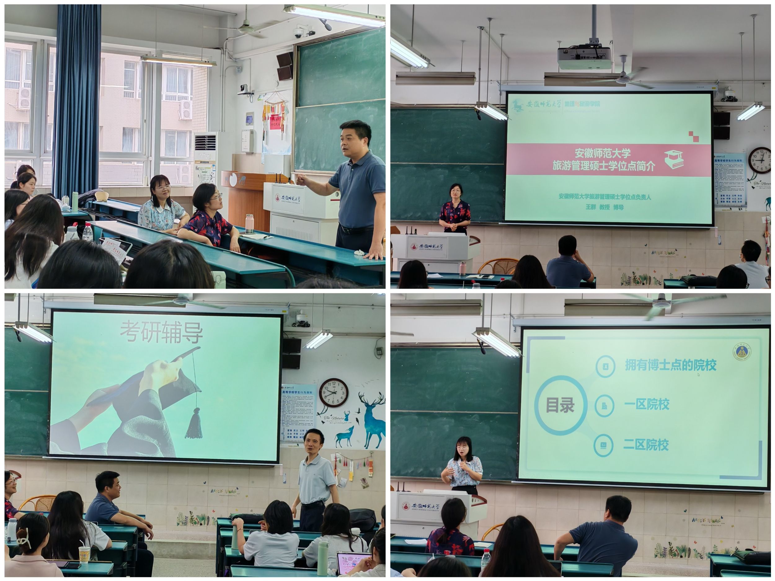 旅游管理专业硕士点及近年来的招生情况,黄剑锋老师鼓励同学们之间要交流经验,共同进步。尹寿兵老师表示后续将为同学们复习考研尽可能提供更好、更个性化的服务,助力大家坚持到最后一刻。会议结束后,同学们纷纷表示获得了很多的报考信息,也对学院和专业提供的帮助感到暖心,并表示一定认真备考,坚持到底。