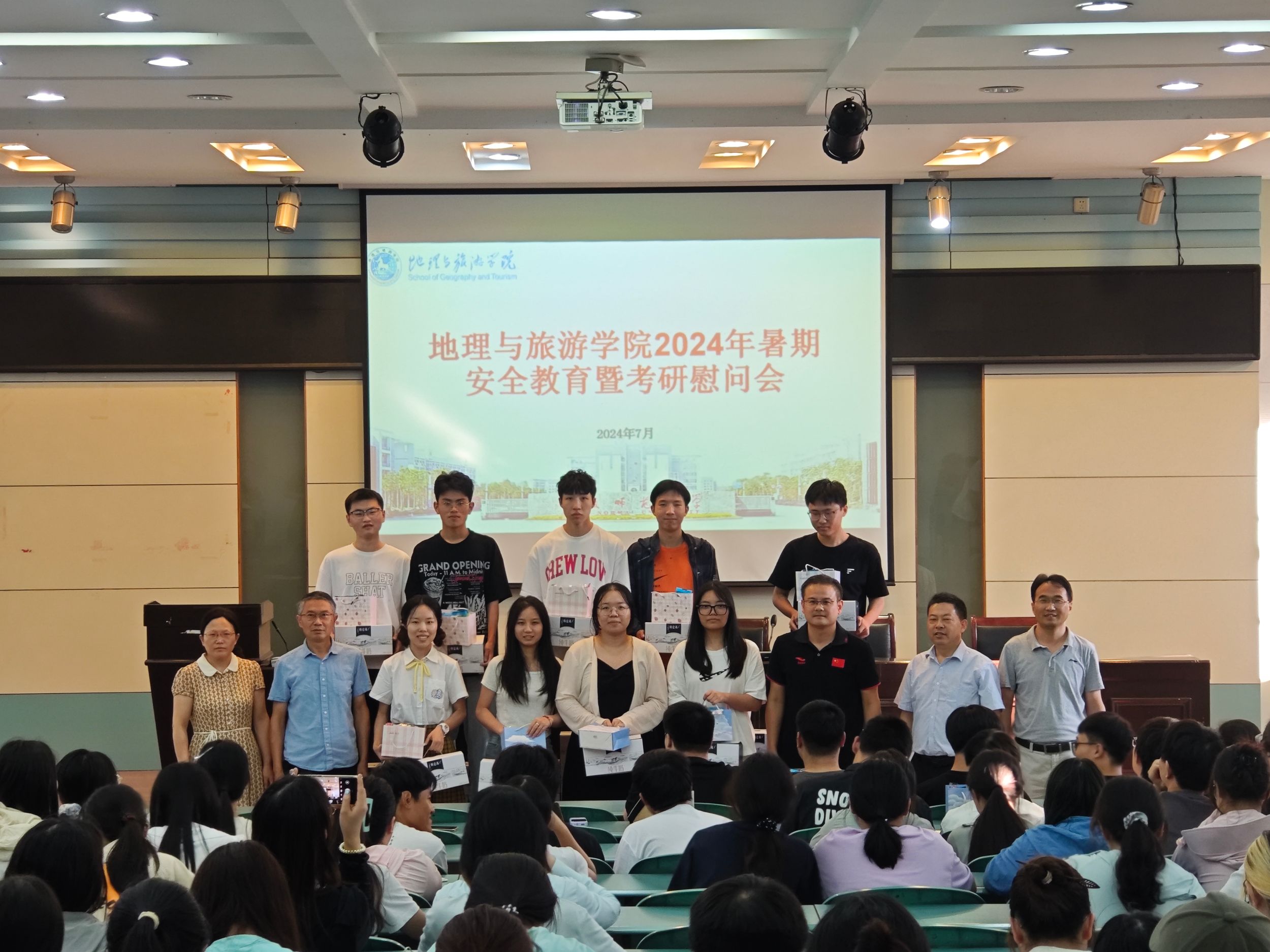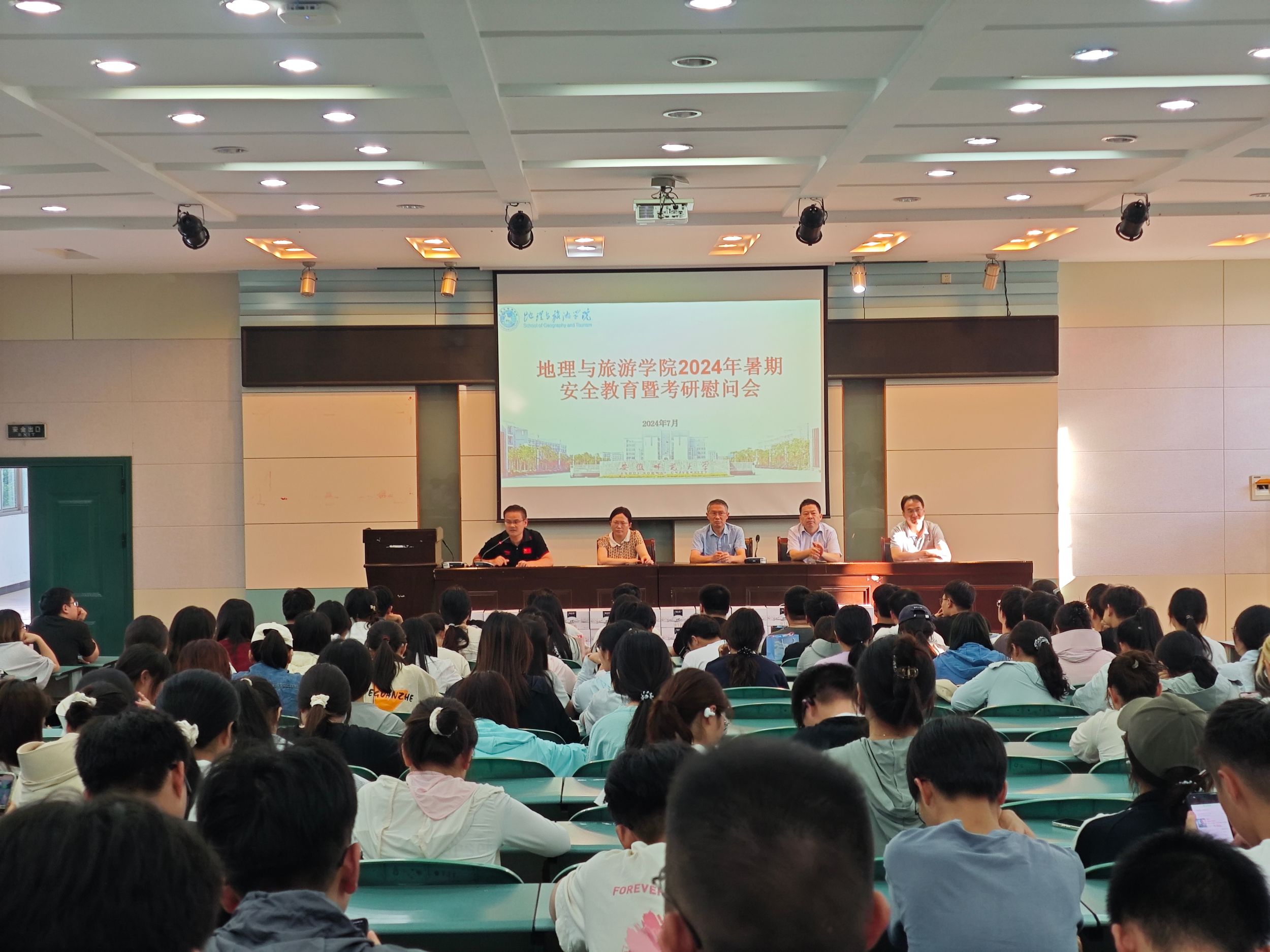 在实验楼101报告厅开展2024年暑期留校学生安全教育暨考研慰问会。学院党委书记贾冠忠、院长方凤满、党委副书记付勇、副院长曹卫东、副院长杨兴柱,相关辅导员及全体留校考研、集训学生参会。会议由付勇主持。