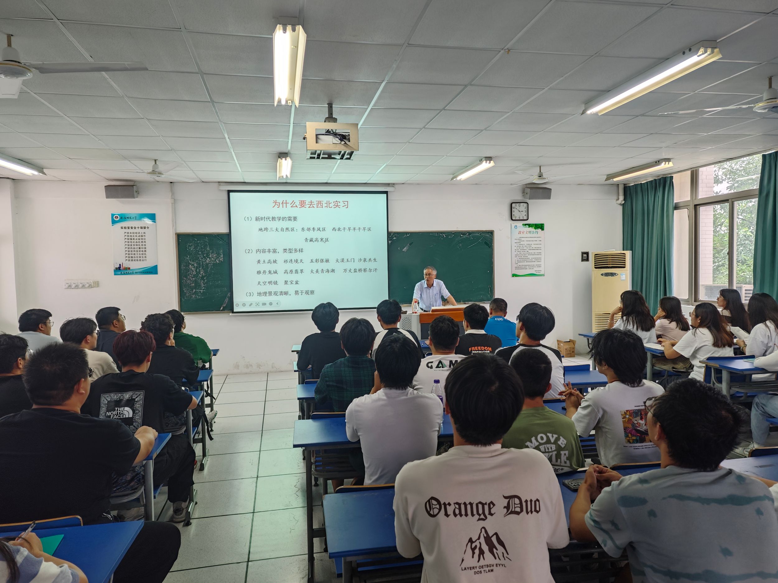 在实验楼101报告厅召开2022级地理科学(拔尖班)西北地区自然地理野外综合实习暨2022级地理科学专业庐山地区自然地理综合实习动员会,学院党委副书记付勇、副院长杨兴柱、地理科学专业负责人朱永恒、西北实习负责人程先富、庐山实习负责人胡春生,全体实习指导老师,以及2022级地理科学(拔尖班)、2022级地理科学(师范)专业全体学生参会,会议由辅导员陈祥云主持。