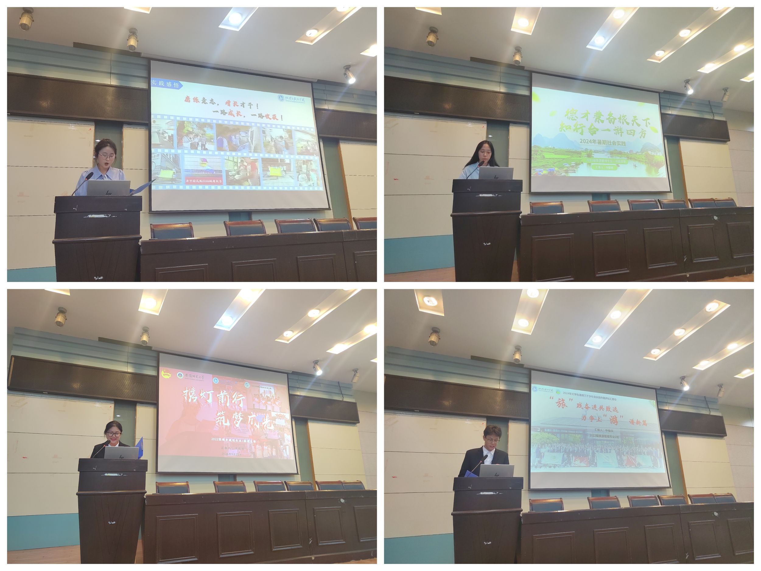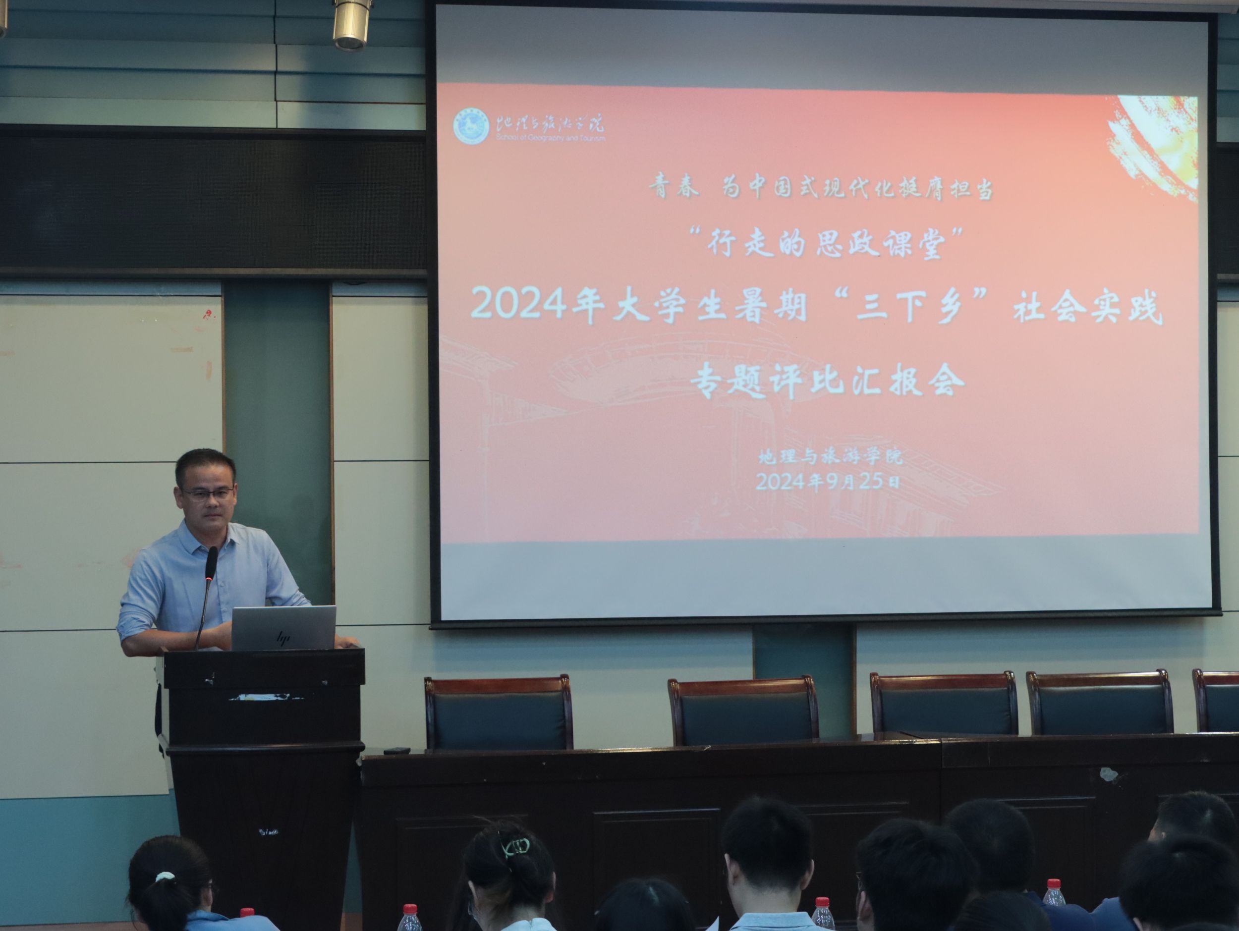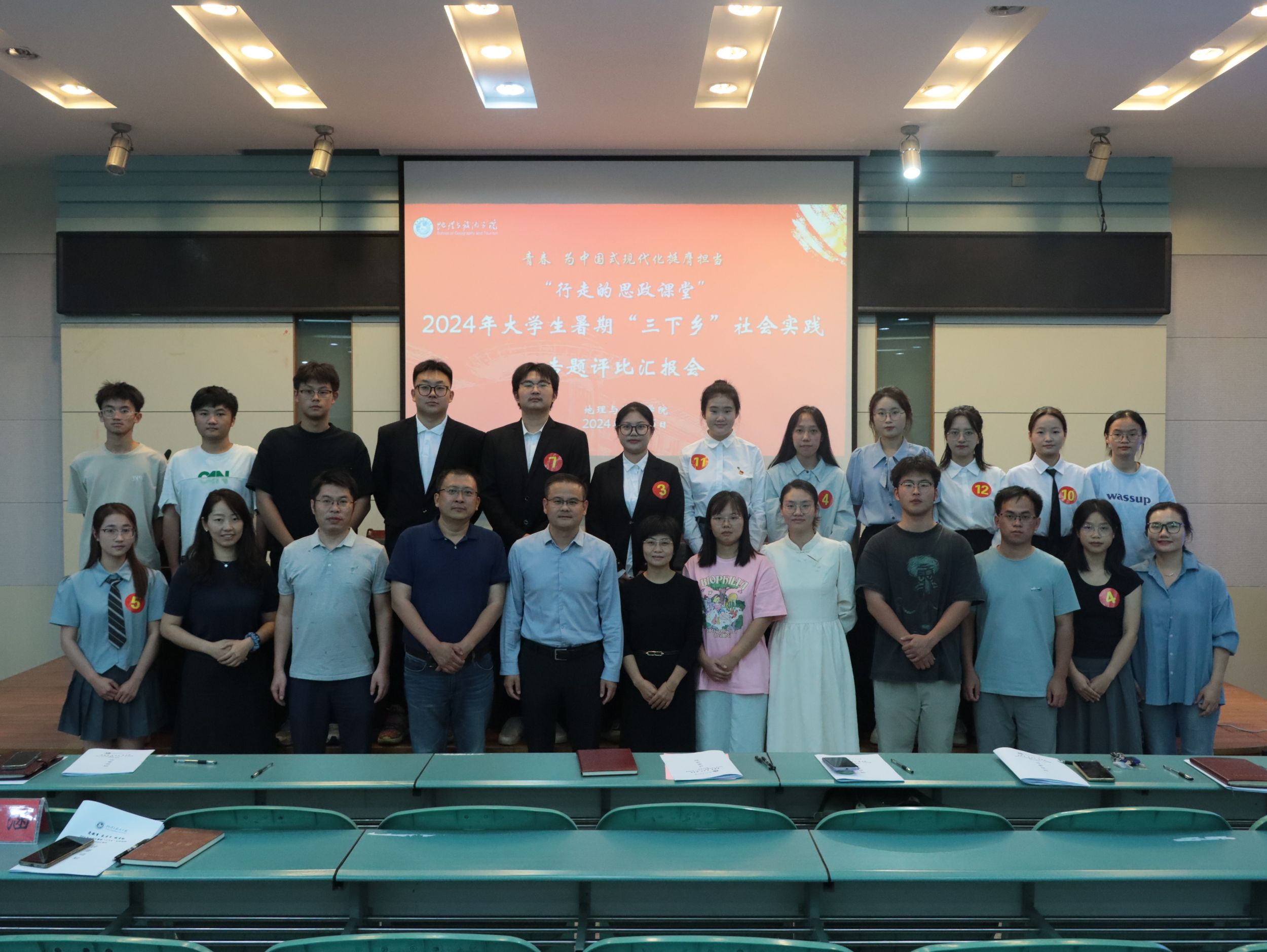 在实验楼101报告厅开展“行走的思政课堂”2024年大学生暑期“三下乡”社会实践专题评比汇报会。学院党委副书记付勇、地理科学专业教师徐仪红、旅游管理专业教师洪学婷、土地资源管理专业教师梁栋栋、城乡规划专业教师王原、地理信息科学专业教师季青、团委书记韦银艳以及专兼职辅导员代表担任本次会议评委,实践团队成员和各班级学生代表观摩学习,汇报会由2023级旅游管理专业学生刘乐主持。