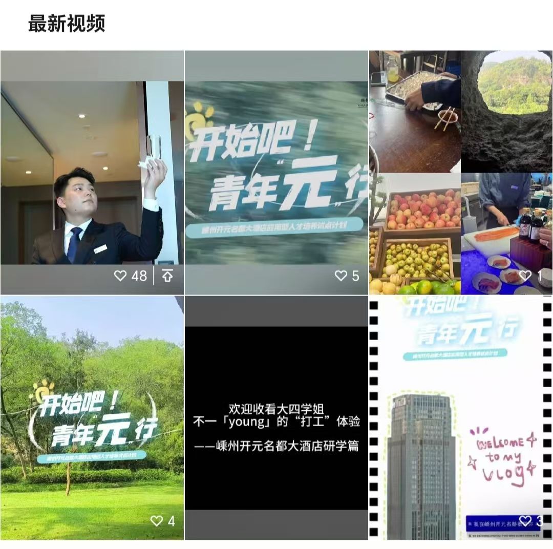 “元”行计划中的最大亮点,是嵊州开元名都大酒店通过招募大二(对行业感兴趣、前置意识培养)及大四(就业选择)的优秀同学开展为期四天三晚的行业探索,同学在此过程当中,各自发挥创意,以新鲜血液带动产品品质年轻化,让活力留在城市地标。此次“开始吧,青年元行”计划行程中,五位同学通过镜头记录下了自己的所思所感所想。同时酒店设置多轮考核,让同学们充分利用新媒体进行“自我营销”,目的也是为了让同学们在认知阶段便对线上新媒体渠道的玩法及基础操作进行培养,在后续实际工作中,能够充分将媒体思维+酒店工作融合创新。