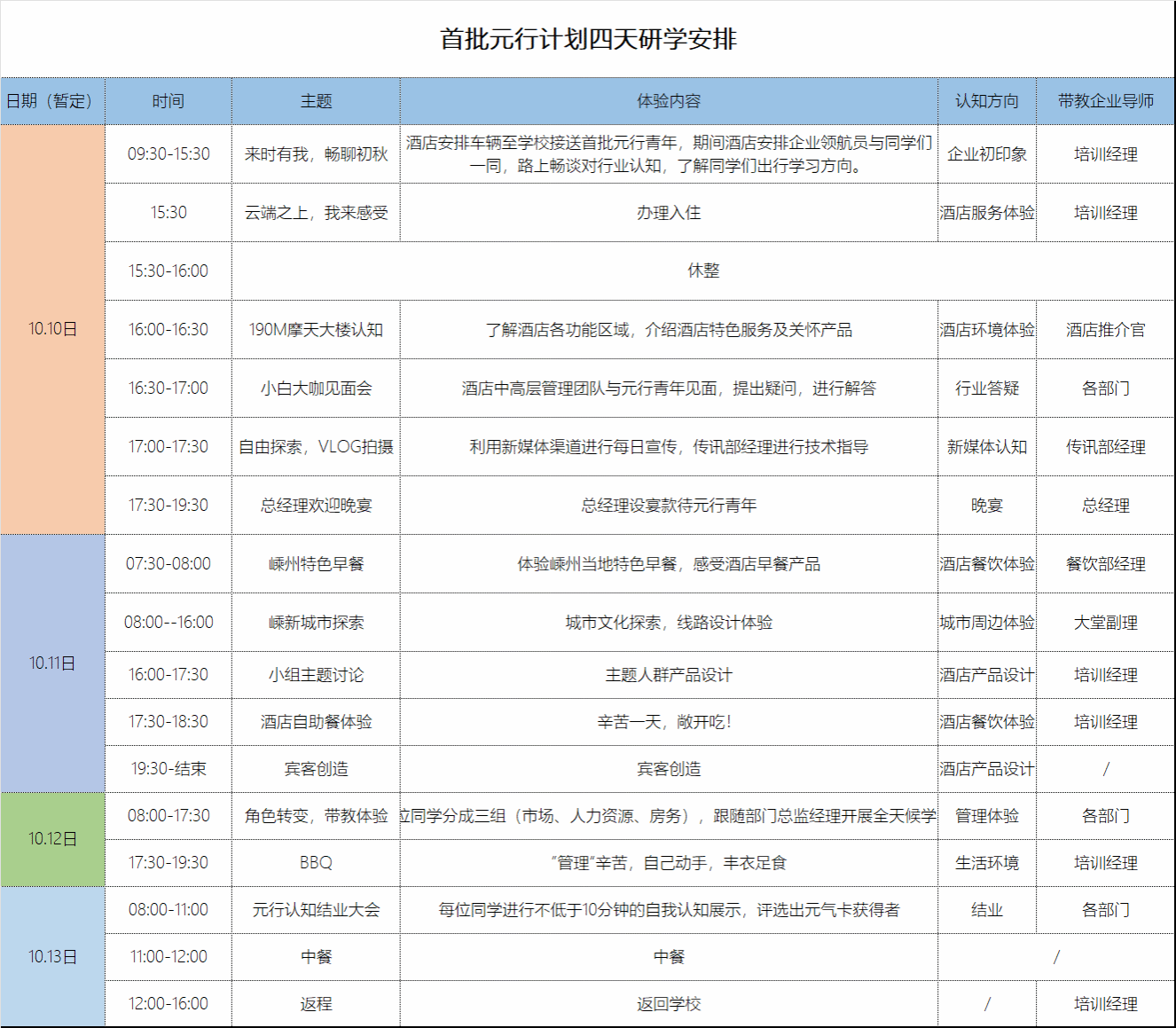 与嵊州开元名都大酒店合作探索促进毕业班职业体验和和能力提升举措,经过前期的座谈交流和系统谋划,10月10-13日,学院5名毕业生代表在嵊州开元名都大酒店参加“开始吧,青年元行”人才培养创新实践,在企业高管的带教下,同学们以宾客视角、员工视角、管理视角开展一系列体验活动,并结合专业提出对岗位的思考感悟。期间,学院党委副书记付勇、旅游管理专业负责人尹寿兵、毕业班辅导员韦银艳一同前往嵊州关心慰问实践学生。