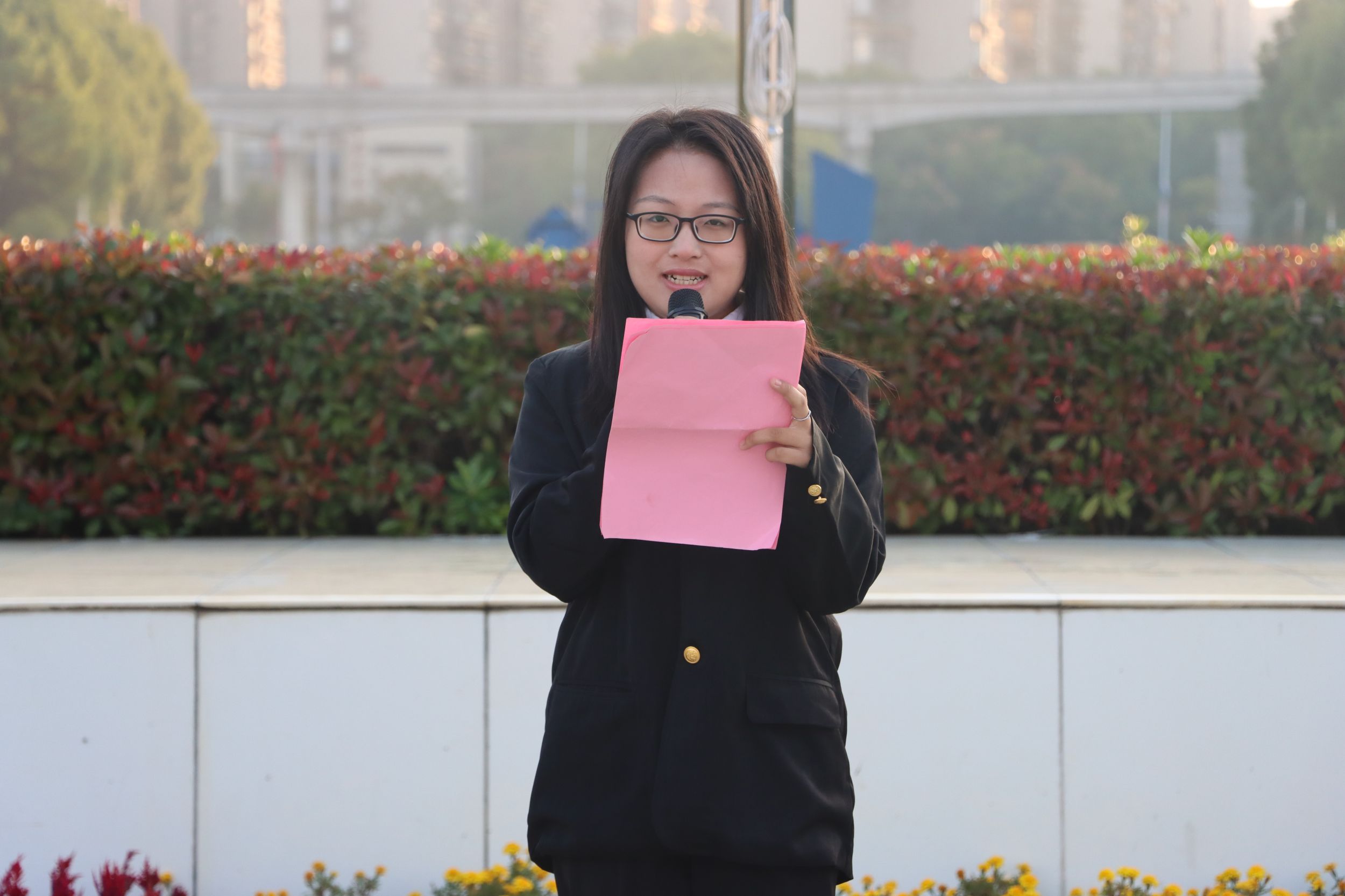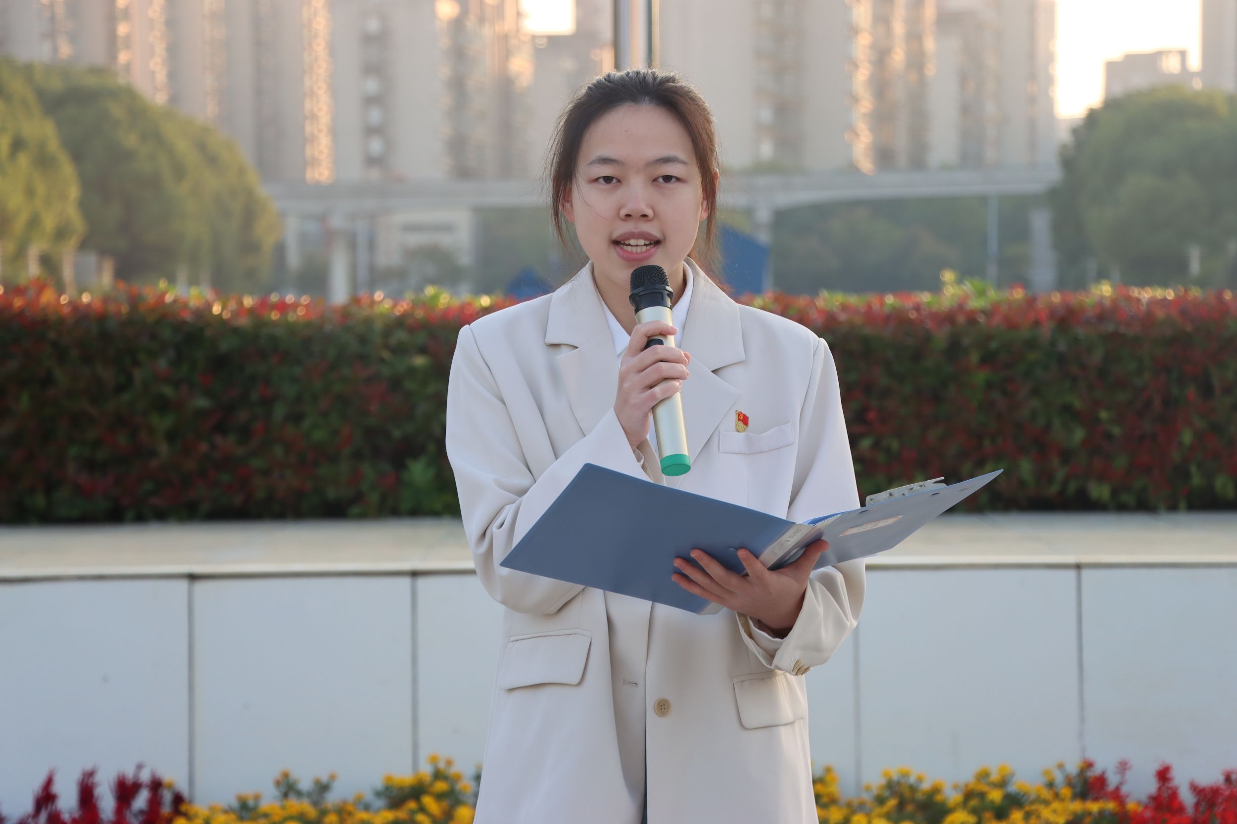 旭日初露,煦色韶光,升旗仪式正式开始。国旗护卫队迈着铿锵有力的步伐,护送着五星红旗走向旗杆。随着《义勇军进行曲》的奏响,五星红旗冉冉升起。全体师生肃立,行注目礼,齐唱国歌。