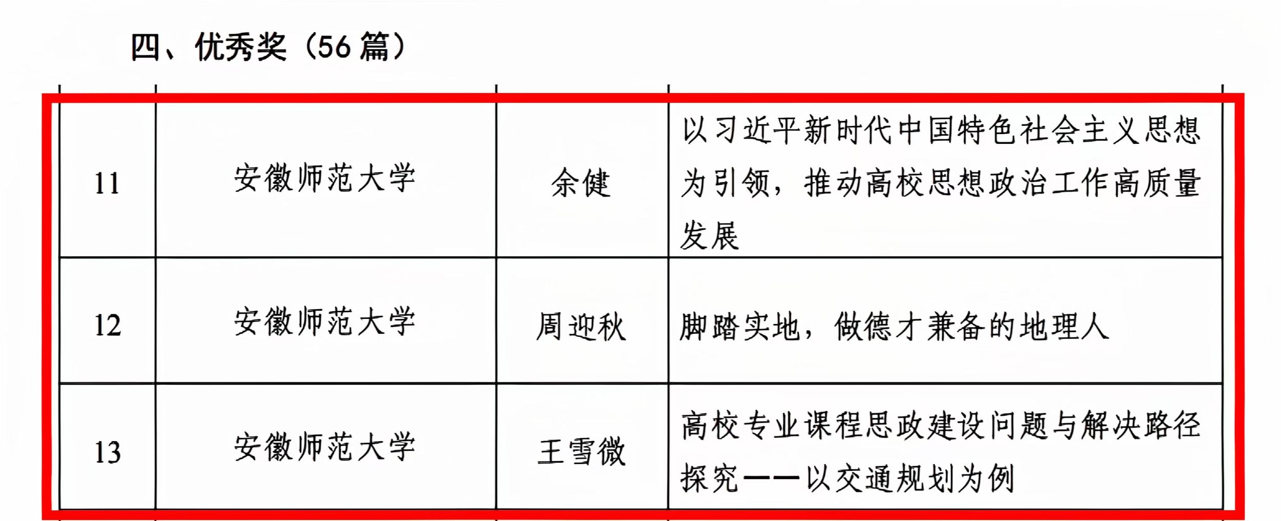 喜获佳绩,分别荣获三等奖1项、优秀奖3项。其中,阮陵老师的《井冈山风景区红色旅游情感认同测度与提升路径研究》荣获三等奖;余健老师的《以习近平新时代中国特色社会主义思想为引领,推动高校思想政治工作高质量发展》、周迎秋老师的《脚踏实地,做德才兼备的地理人》和王雪微老师的《高校专业课程思政建设问题与解决路径探究——以交通规划为例》荣获优秀奖。