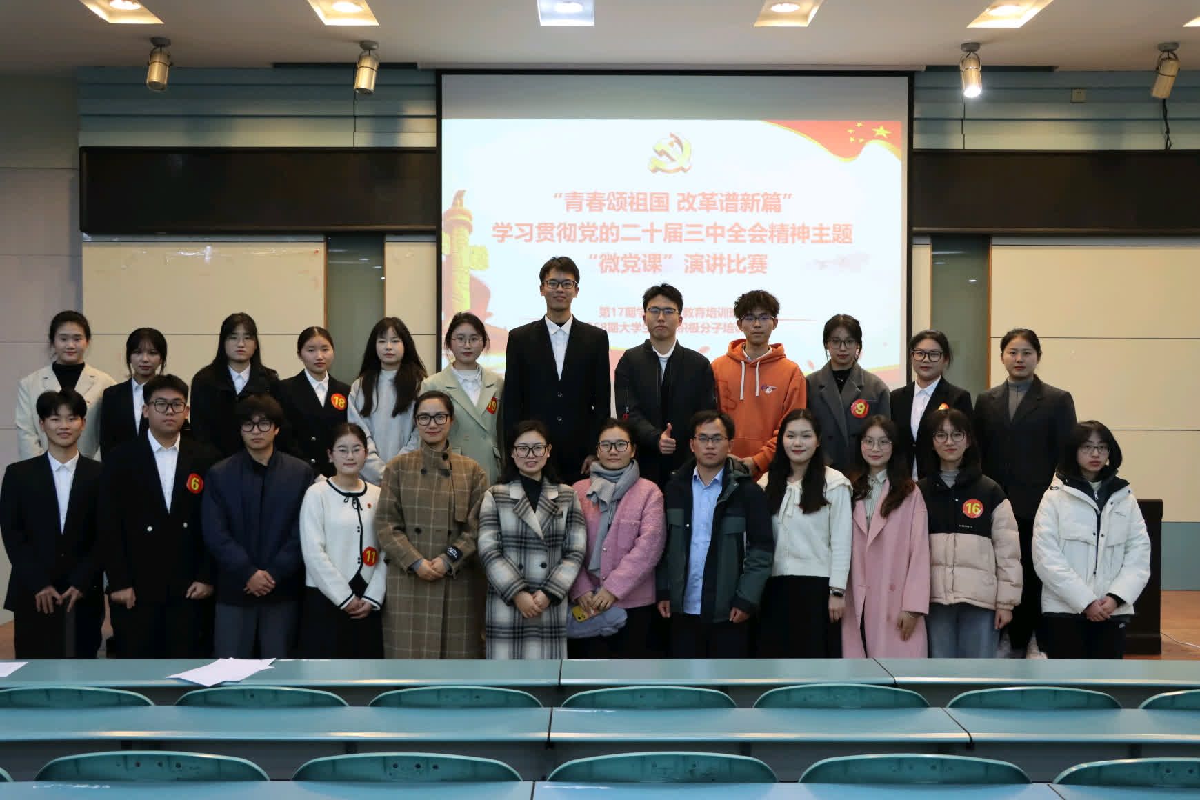11月29日晚7点,学院开展了“青春颂祖国,改革谱新篇”学习贯彻党的二十届三中全会精神主题“微党课”演讲比赛。经过提交作品的初选后,大赛共选出了19份优秀微党课作品进入此次的汇报展示环节。2022级城乡规划专业王冰冰,以“聆听文化回响,共看繁花似锦开”为主题,生动诠释了回顾历史溯源,赓续传统文脉,焕新创新融合。2022级旅游管理专业韦华妮,通过列举孙颖莎、徐枫灿等优秀事迹,引出青年学子要扛起青春责任,嘹亮奋斗号角,脚踏实地,铭记时代使命。2022级地理信息科学专业夏心雨,以中国青年科学家黄芊芊和中国航天员桂海潮为榜样,立“破冰前行,革故鼎新”之志,志存高远,锐意进取,勇担历史使命。参赛选手各展风采,以独到的视角解读了个人青春与国家深厚关联,以诚恳的态度表达了对国家未来的展望与对自己奉献国家的希冀。不负青春,不负时代,铭记初心使命,书写青春华章!。
