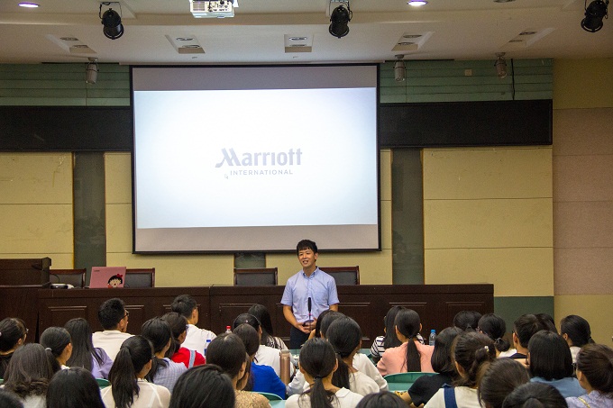 19日晚19:30,旅游管理、酒店管理和旅游管理专升本230名全体2018级新生让学院实验楼101教室座无虚席,万豪国际集团中国区校企关系总监陈雪芬、校企关系经理朱程共同作了题为《踏上旅程》的新生专业思想教育专题报告。报告由学院党委副书记乔静主持。陈雪芬将自己31年的高星级酒店从业经历娓娓道来,清晰地勾勒出酒店职业经理人的职业生涯。她以万豪集团为切入点,结合各类生动的工作案例,深刻剖析了酒店等服务行业的工作内容和发展前景。朱程介绍了集团管理培训生项目,通过对项目选拔面试和培养过程的案例再现对全体新同学提出了自我塑造的建议。最后,两位嘉宾认真解答了现场提问,报告在热烈的掌声中画上圆满的句号。