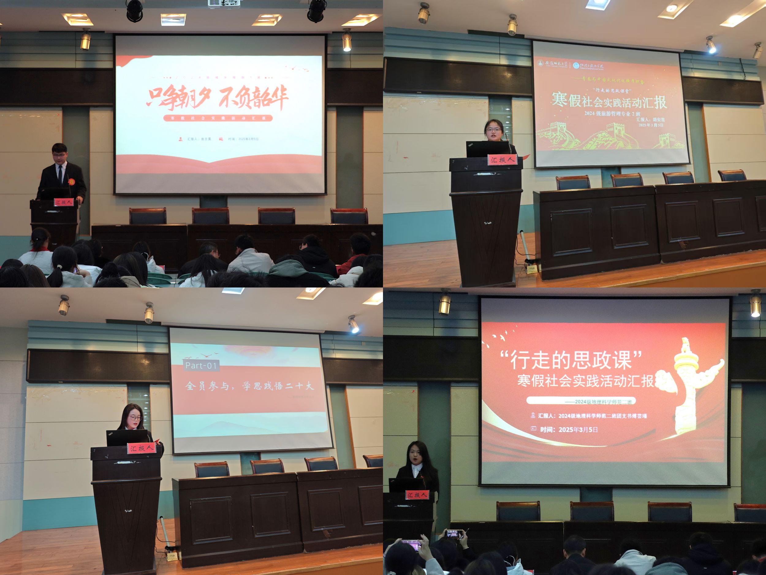 各个班级团支书分别从参与情况、实践过程、优秀成果展示和反思总结等方面汇报了各自班级寒假社会活动的实施成效。其中,23级地理信息科学1班构建“全周期实践守护机制”,建设六大课程矩阵,通过三重护航流程保障全体同学高质量完成实践,高效完成社会实践活动。23级旅游管理2班的同学深度融合专业特色与社会实践,在博物馆中进行讲解服务工作,既提升了个人技能,又为文化传播贡献了一份力量。各班级以图文并茂的PPT呈现寒假实践成果,通过案例分享生动还原志愿服务、职场体验等场景,在总结实践收获的同时,深刻反思不足之处并提出改进方向,充分彰显了知行合一的育人实效。