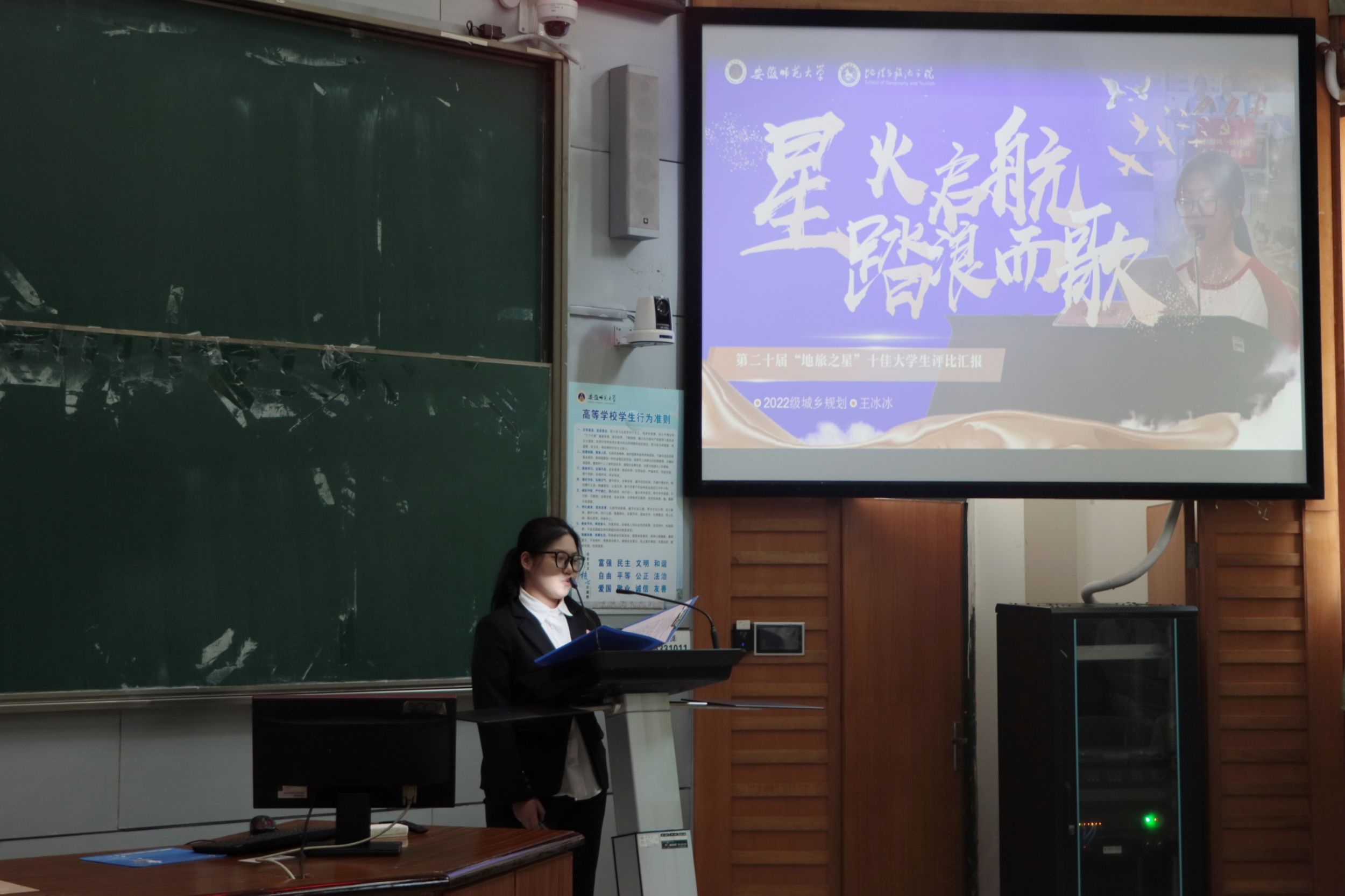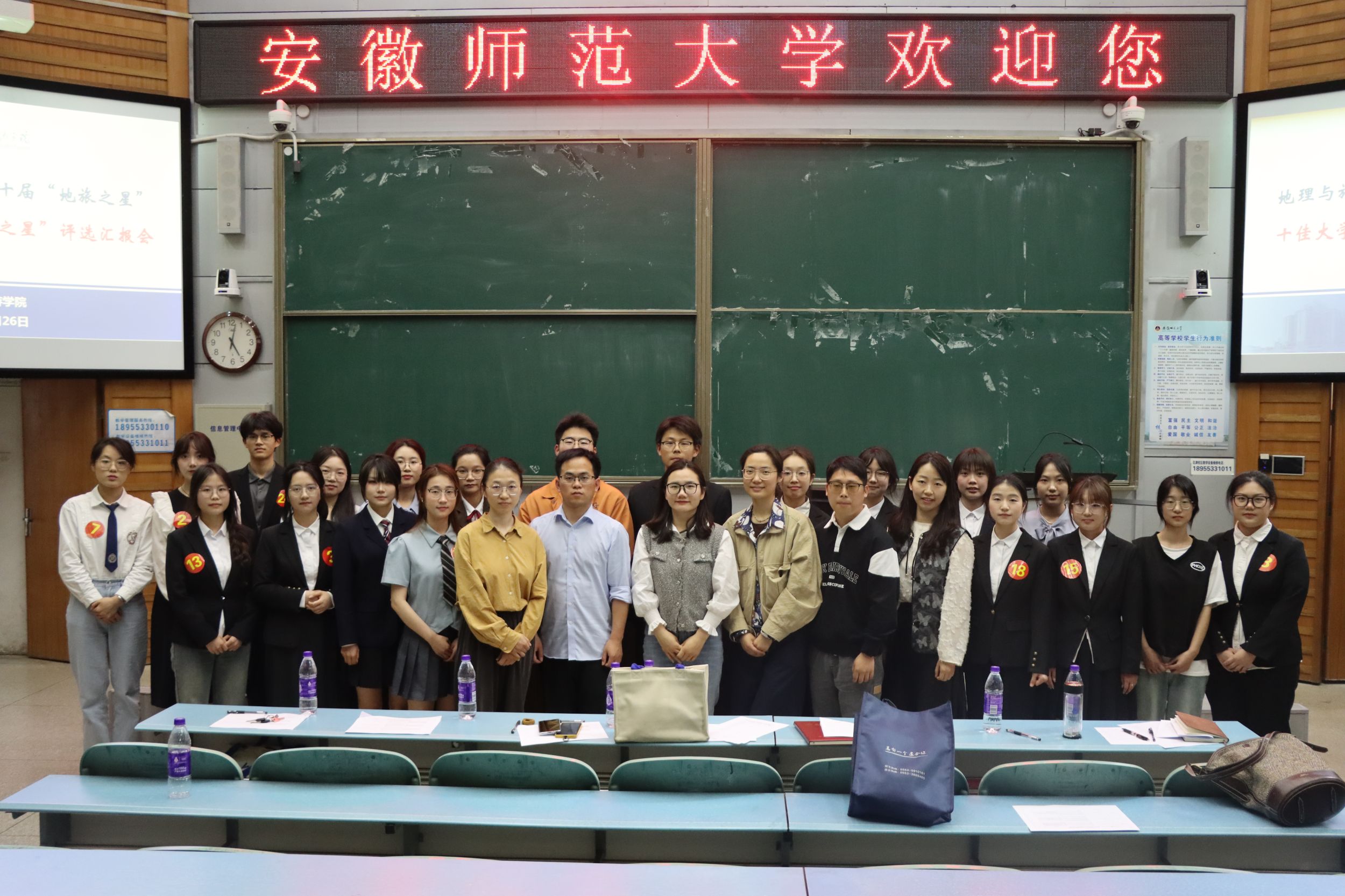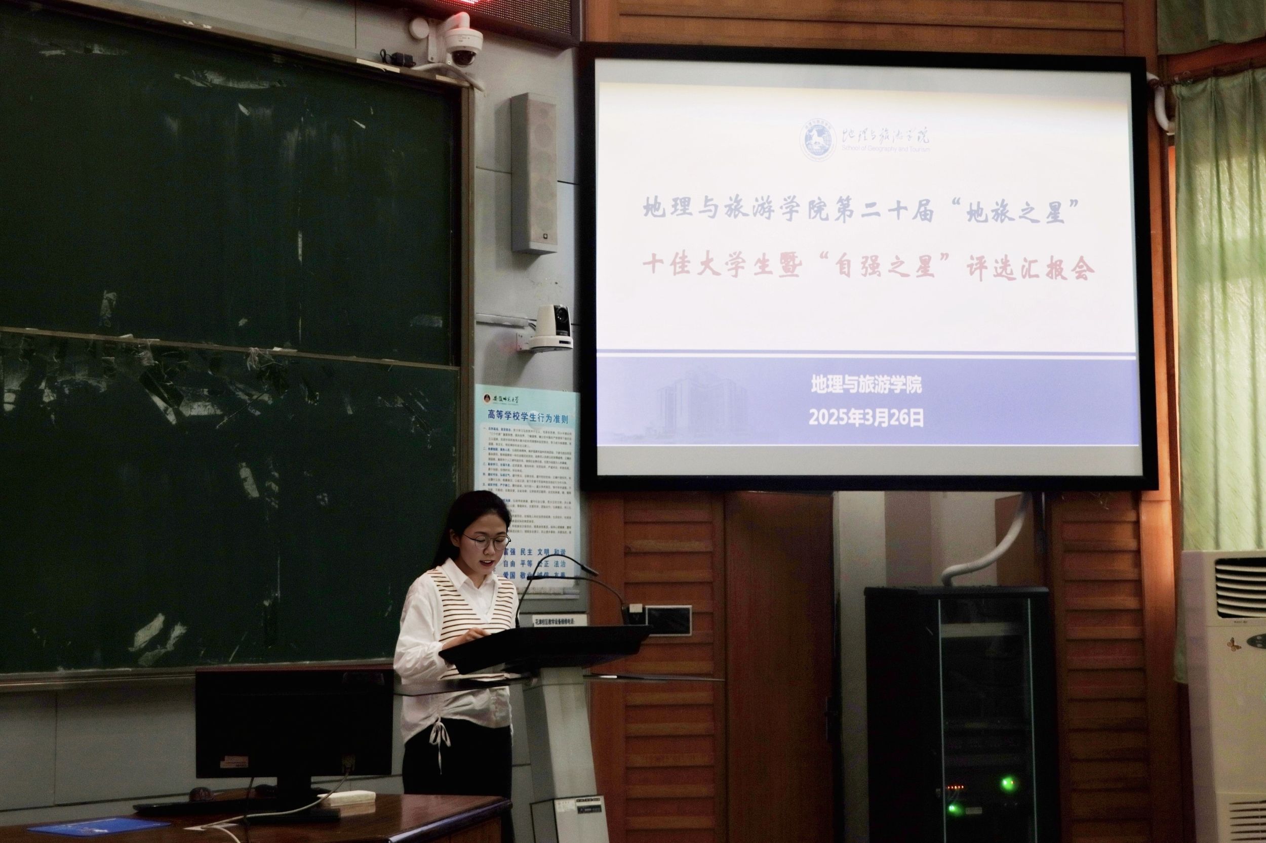 于行知楼1号楼105报告厅举行第二十届“地旅之星”十佳大学生暨“自强之星”评选活动。学院党委副书记付勇,学院团委负责人以及各专业辅导员老师代表出席活动并担任评委,各班学生代表现场聆听并参与评审。