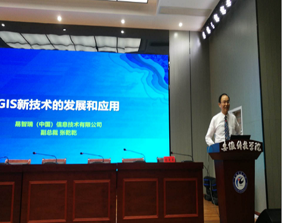 决赛结束后,易智瑞(中国)张乾乾副总裁作了题为《GIS新技术的发展与应用》的报告,分享了地理信息学术技术与大数据、AI、区块链、互联网+结合下GIS发展的新热点和新趋势,报告紧跟当前GIS技术发展的最前沿,同学们认真聆听、交流热烈,报告取得良好成效。