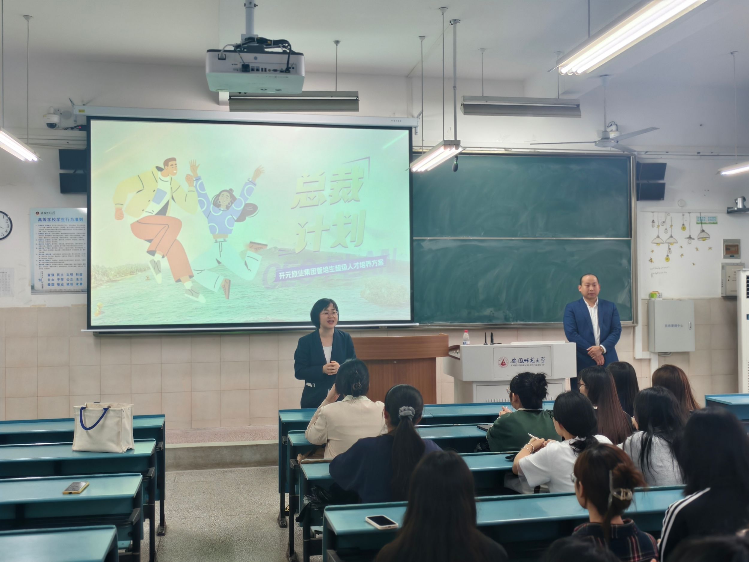 会后,黄素梅等人面向旅游管理专业毕业班学生和低年级学生开展总裁计划和青年元行计划宣讲。