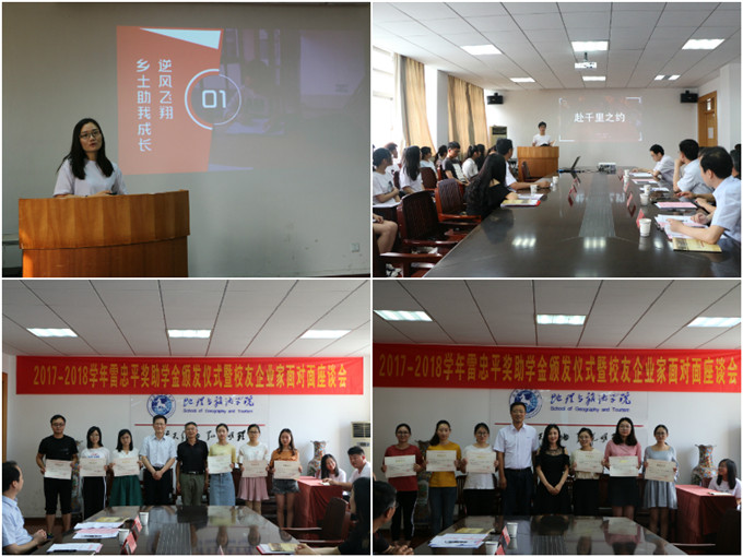 2014级旅游管理专业韦银艳、2015级旅游管理专业梁宜人、2015级地理科学专业朱珠和2016级酒店管理专业舒涵作为获奖受助学生代表分享了自己的成长历程,并对雷忠平先生的捐资助学表示感谢,并立志在以后的学习生活中,将这份帮助和善意传递下去,心存感恩,怀揣梦想,不断前行,以实际行动回馈社会、报效国家。