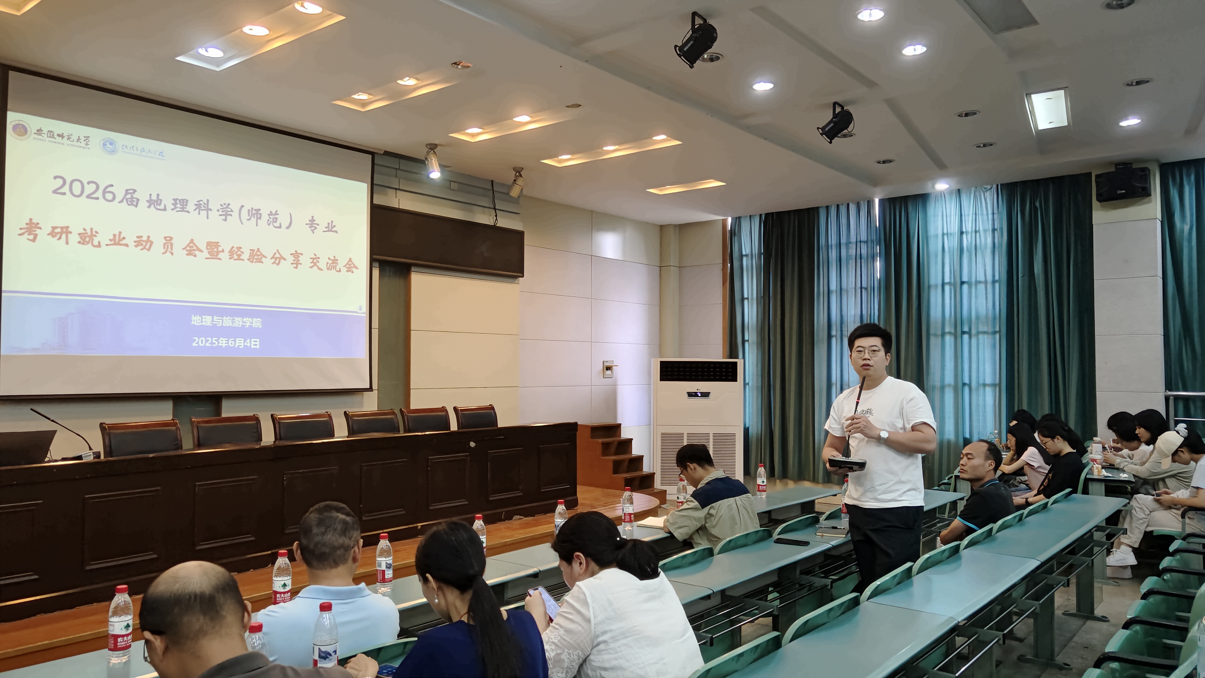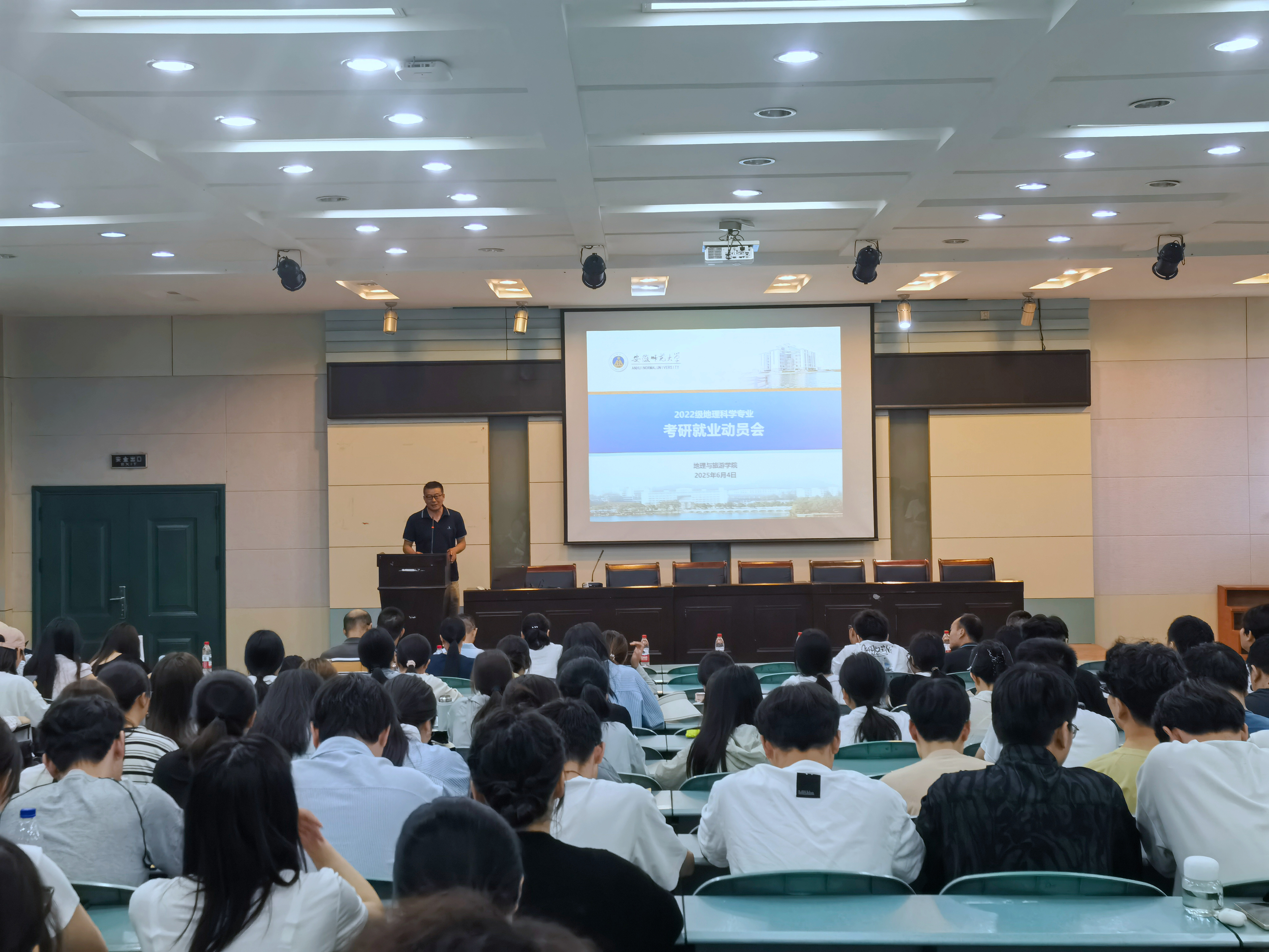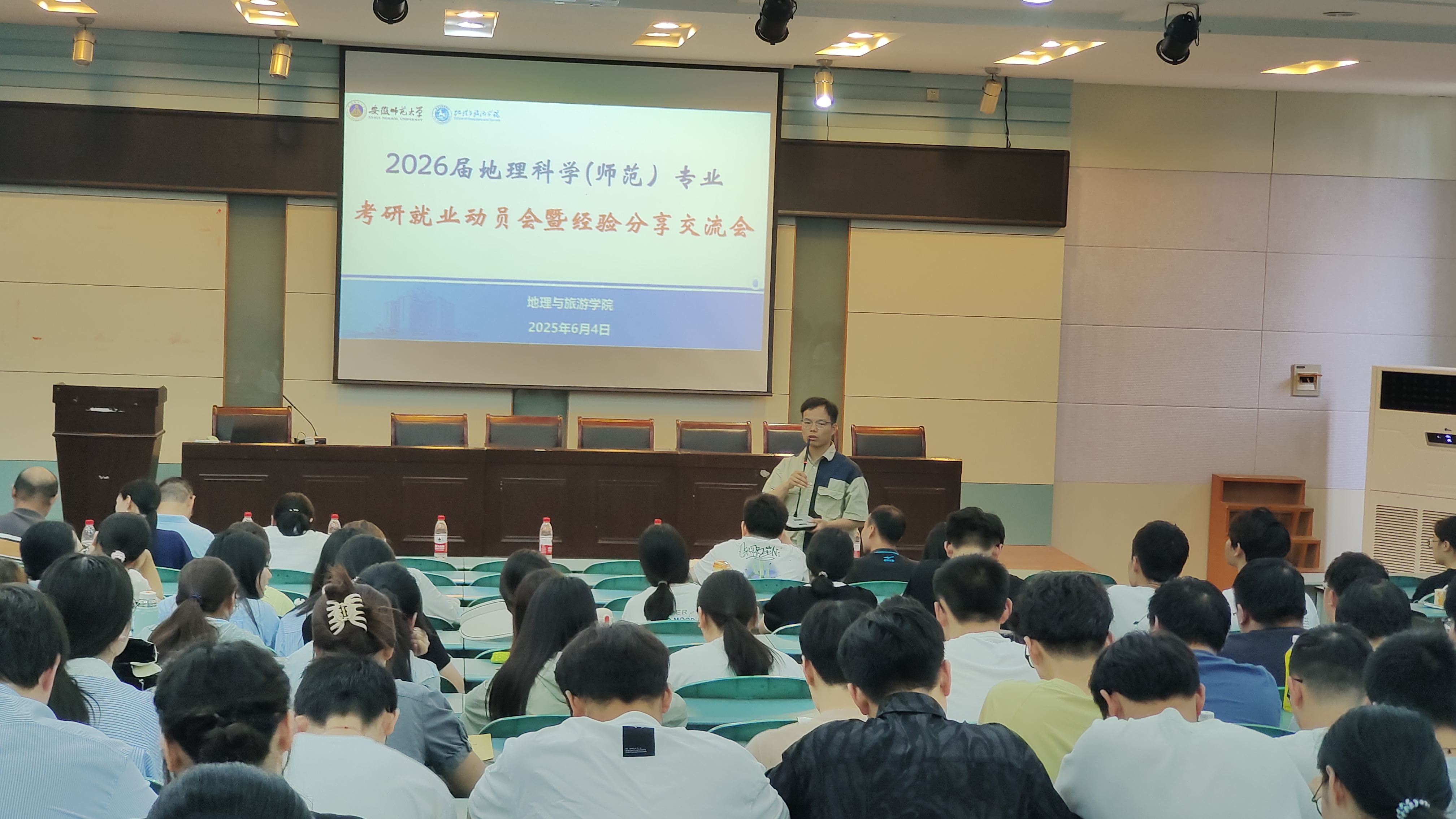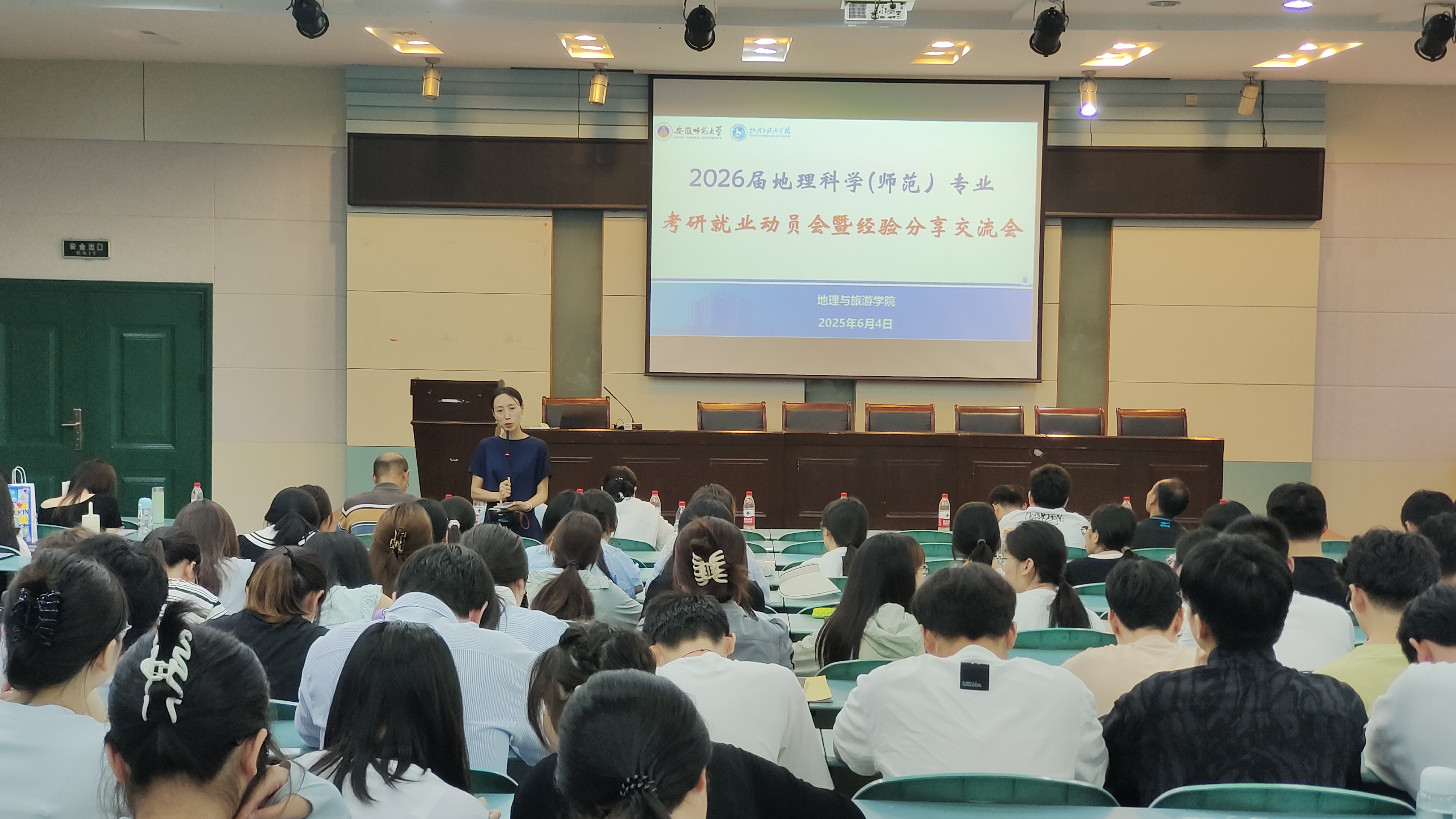 在学院实验楼101报告厅召开2026届毕业生考研就业动员暨经验分享交流会。地理科学专业负责人,专业教师代表,2021级考研考公上岸本科生代表汪慧、刘晓萌、周复及2026届毕业生参加。会议由辅导员操晶晶主持。