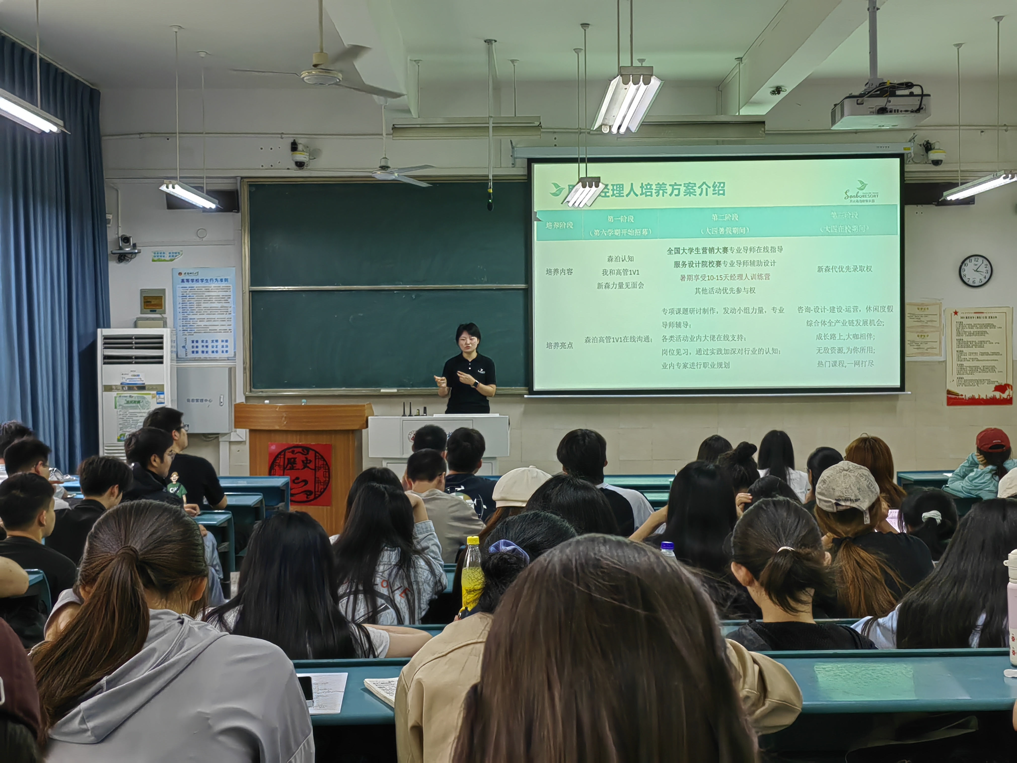 宣讲会上,吴燕就开元森泊“职业经理人培育计划”向同学们重点解读了培养方案内容、人才培养体系、职业发展路径。她表示,职业经理人培育计划重点面向全国优质高校旅游管理专业、对行业有热情并且愿意长期从事行业工作的在校本科生进行招募宣讲,在校前置培养,降低试错风险,毕业即可入职,培养过程中森泊高管“一对一”全过程亲自指导、全时段在线沟通、全领域跟岗培训,个性化定制专项培育课题和“新森代”1-2-3专属培养路径,完美融合森泊三级人才储备体系,联动多校多园,成长路上、大咖相伴,无敌资源、为你所用,热门课程、一网打尽,通过2+N导师制对高质量本科学校毕业生进行行业认知及职业发展认知培养,深化校企合作,助力同学们迈好从校园到社会求职就业、角色转换的第一步。