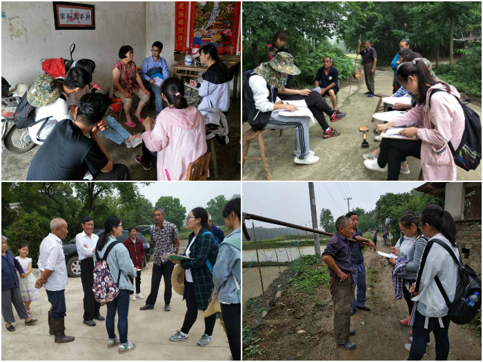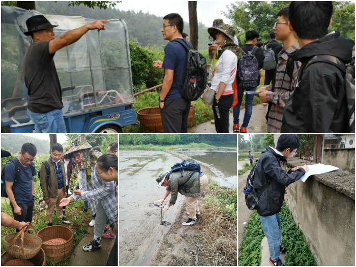 下午按照分组,每组7-8名学生,大家分组去各冲调查,三位老师轮流去各组进行现场讲解。老师们嘱托大家要先熟悉地形,提醒大家要明确分工,只有分工合作才能最有效率地完成任务。朱老师又叮嘱大家安全第一,一定不能单独行动,随时保持联络。每组由先分工,两位同学去测破地的坡度,两位同学取土观察土壤剖面,还有四位同学向冲头去寻找山塘并分析水文特征,然后在老师发的地形图上画出水渠位置和流向。最后,小组一起去村落里对村民进行了访谈与调研,务农收入较低,村落里大多是留守的中老年人,农民并不希望耕地被征用,但近年来农村耕地渐渐被其他规划用地占用,剩余的土地多被大户统一承包,在城市化的进程中农村该何去何从一直是值得思考的问题。