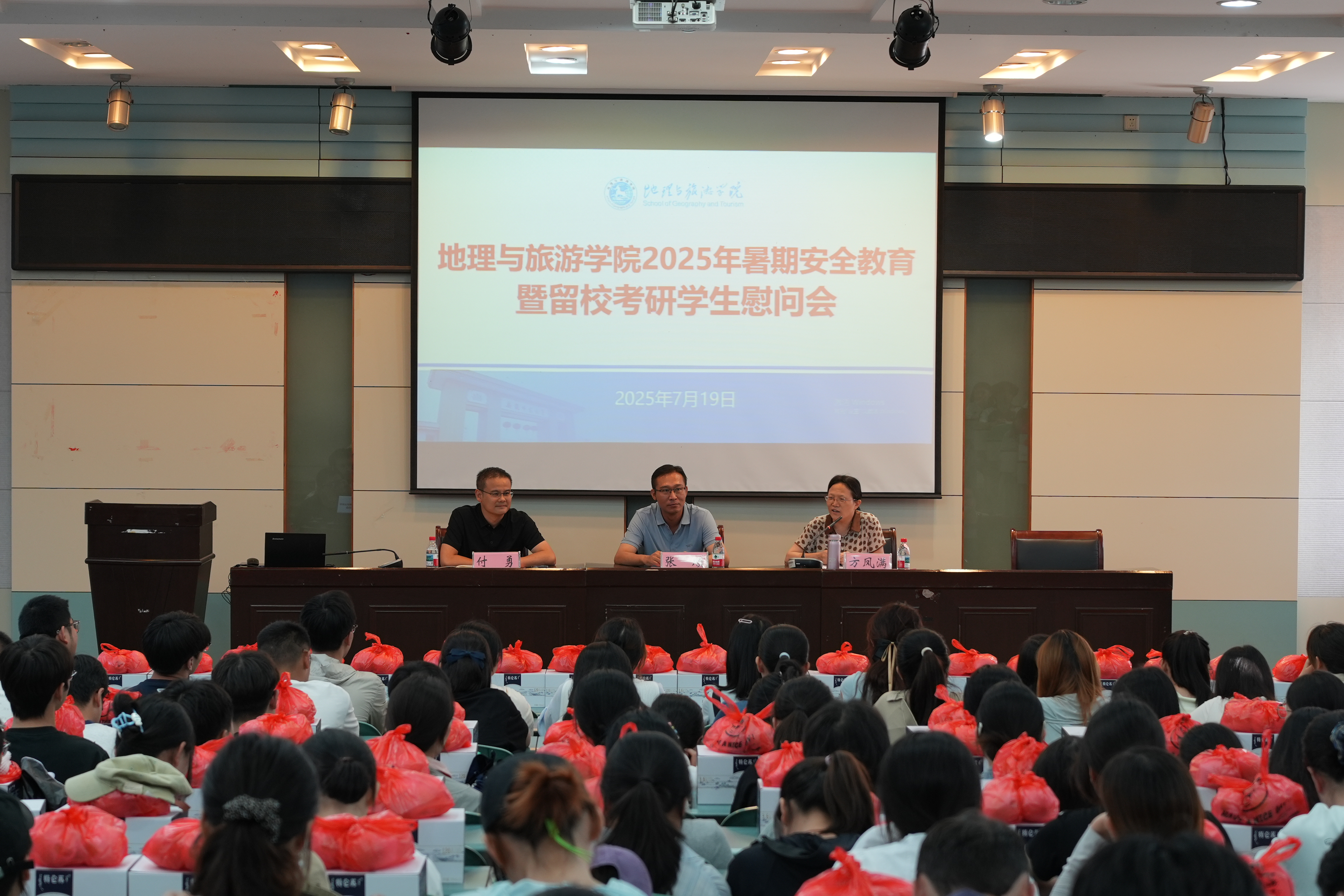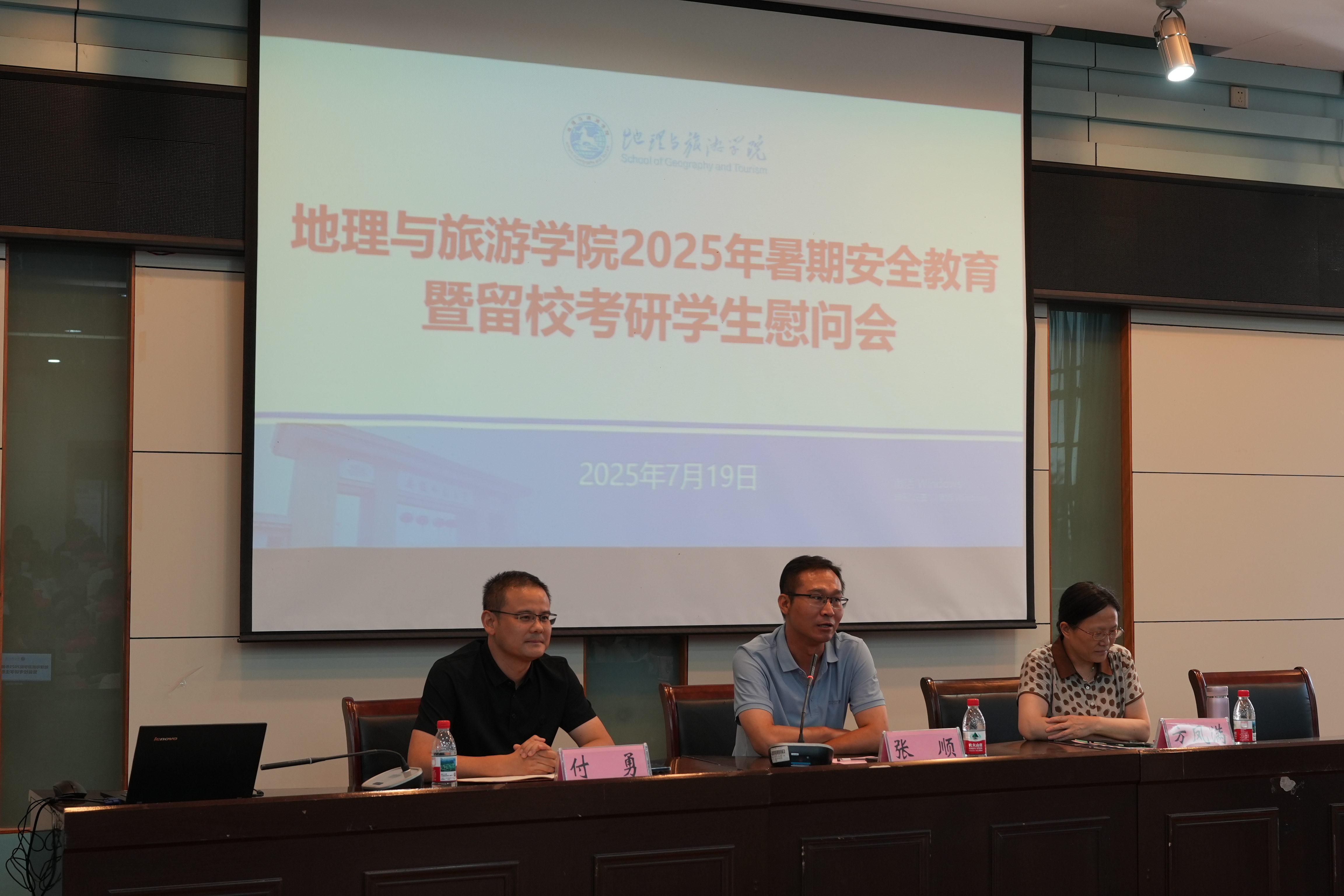在实验楼101报告厅召开2025年暑期留校学生安全教育暨考研学生慰问会。学院党委书记张顺、院长方凤满、党委副书记付勇,2026届毕业生辅导员陈祥云,以及全体留校考研学生和竞赛集训学生参加会议。会议由付勇主持。