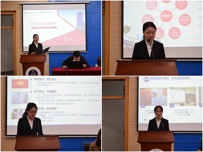 其中,来自2014级旅游管理的徐倩,通过阐述大四学生逐梦路,表达了自己不忘初心,坚持梦想的过程,给低年级的同学上了生动的一课。来自2015级地理科学专业的朱珠,用王国维在《人间词话》中说到的“三种境界”讲述了自己在大学期间政治追求、社会工作以及科研实践等方面的诸多收获。当她展示自己参加为期24天的“中国第二次青藏高原综合科学考察研究暨‘河湖源科考’”行动的路线时,更是赢得了台下评委和同学的阵阵掌声。2015级城乡规划的魏宁,则展现了她心在远方的远大目标,路在脚下的踏实勤恳,处处体现了当代大学生充分将理想与现实相结合的发展理念。来自2016级地理科学专业的解维,以辩者的身份讲述了她无畏且直前的精神和行动。以缜密的思维去看待志愿服务,学生工作,学习过程,她的讲述散着发辩者的魅力。