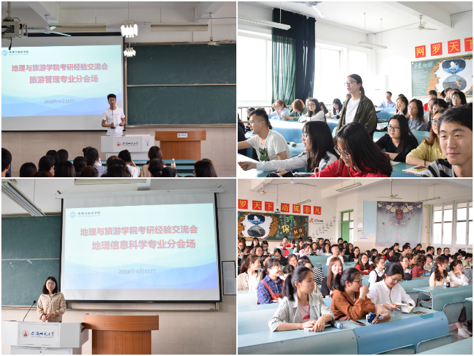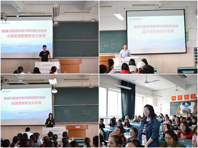 考研交流,助力新人才成功追梦。会议结束后,同学们分别前往各自专业所在分会场,与2014级考研优秀代表进行考研交流与分享。各专业的考研代表首先就考研注意事项进行分享。在地理科学分会场上,刚刚考取华东师范大学的吴家豪给学弟学妹们讲述了考研学校选择、专业的兴趣与对口程度等问题。考取华东师范大学的2014级旅游管理专业丁秋建同学也就同学们十分关心的“考研数学怎么学”这一问题详细地讲述了自己的学习方法。被北京交通大学录取的胡璇也将自己一年的考研历程传授给台下的 学弟学妹们,她告诉大家考研路上要坚持下去,永远为时不晚。在场的考研代表尽所能为学生答疑解惑,在场同学均表示受益匪浅,现场气氛活跃。