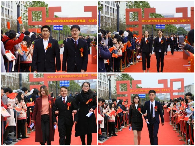 在花津礼堂隆重举行2016-2017年学生先进集体先进个人颁奖典礼。校领导、机关各部门负责人、各学院党委书记、学生先进集体代表、先进个人和学生代表参加本次典礼。下午2时许,颁奖典礼在舞狮精彩表演中拉开序幕,随着吉祥物安安和诗诗的亮相,国家奖学金获得者、三好学生标兵代表、优秀学生干部代表等一大批师大优秀学生代表携手亮相红毯,投放青春心语,在荣誉墙上签名留影。签名结束后,各优秀个人与代表一同与校领导合影留念。在聚光灯的闪烁下,各与会代表陆续步入会场,颁奖典礼正式开始。校领导和相关负责人分别为受表彰的学生和代表献戴花环并颁发荣誉证书。