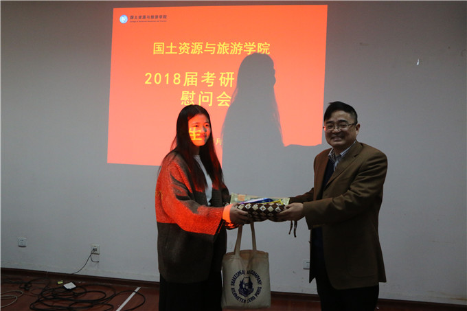 会上,院长苏勤代表学院领导老师对考研学生表示关怀与慰问,激励同学们在冲刺的最后阶段坚持到底、正视压力,在复习的关键时期重视实践、定点清查、劳逸结合,在考试前一周劳逸结合,使生物钟与考试时间协调。苏勤院长表示,学院将是所有考研同学的强大后盾,并将尽一切努力为大家创造良好考研条件。