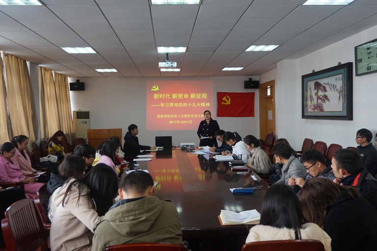 2017年12月1日,国土资源与旅游学院自然人文研究生党支部在国旅学院行政楼三楼开展以“新时代 新使命 新征程——学习贯彻党的十九大精神”为主题的党日活动,本次活动由党支部书记从然老师主持参加并主持。