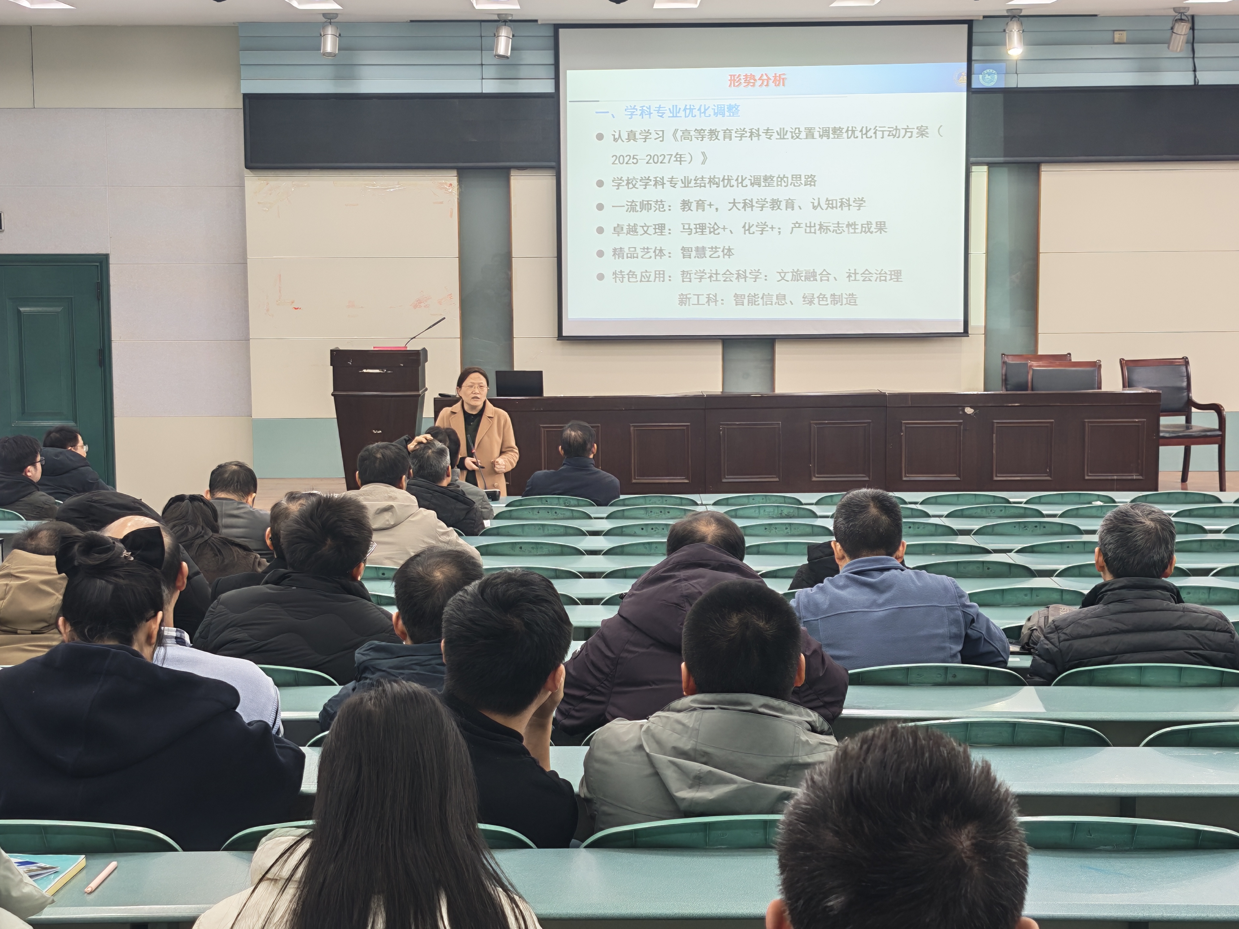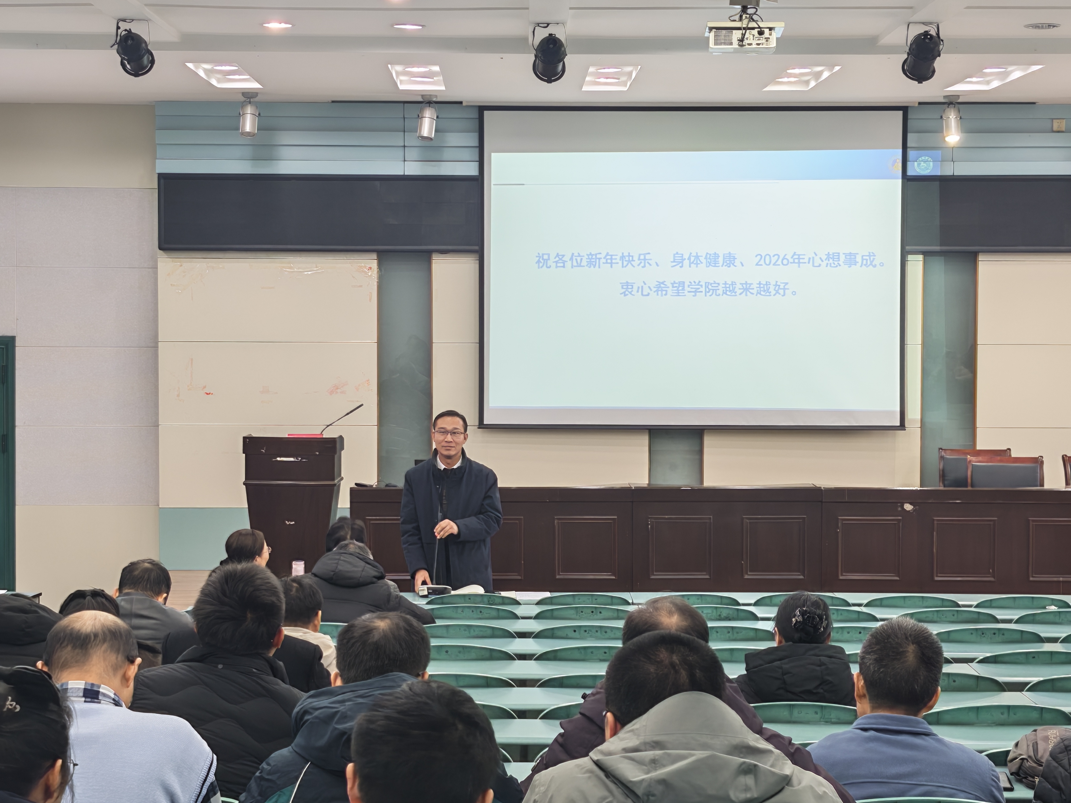 年终总结会上,院长方凤满通报了2025年学院在职称评审、创新型人才培养项目立项和标志性科研成果突破等方面取得的亮点成果和突出成绩,强调了聘期考核和绩效工资改革、科研基金申报、财务规范报销等重点任务和目标要求。她就专业设置优化、学科发展变化、科研成果转化等导向转变,明确提出“学院怎么办、个人怎么办”的重要问题,指出要科学谋划“十五五”发展规划,推动专业转型升级,凝练学科发展方向,拓展深化校地合作,在推进学科专业设置调整和服务区域经济社会发展中不断拓展发展空间。