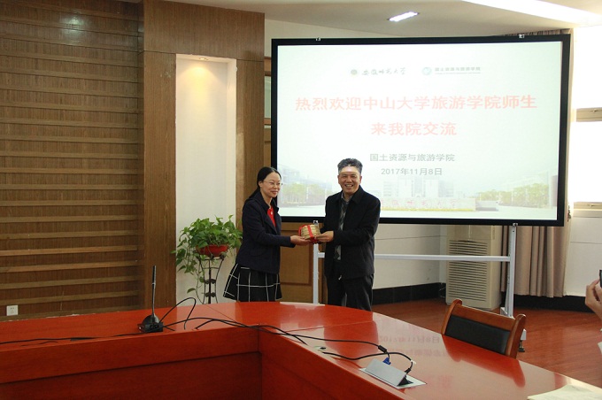 国旅学院的热情接待表示衷心感谢,并向陆林赠送了中山大学旅游学院院长、博士生导师保继刚教授精心准备的纪念品,向方凤满赠送了中山大学旅游学院的印章,以示两校两院的友谊代代传承。