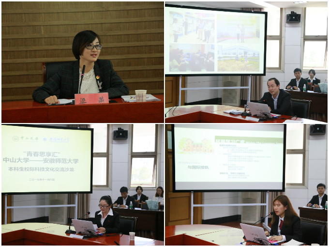 委员会致欢迎辞,介绍了我校的悠久历史和办学发展概况,并肯定了国旅学院创办“青春思享汇”本科生校际科技文化交流沙龙活动品牌的积极意义,为我校团员青年加强与兄弟友好学校团员青年的交流学习搭建了新的载体和渠道。她指出,中山大学旅游学院的专家老师和优秀学子从“百岛之城”珠海赶来“江城”芜湖,同我校师生进行交流,是对我校特别是国旅学院旅游管理专业人才培养工作的信任和支持。她希望中山大学的老师同学们在活动期间对我校和学院、专业的各项工作,尤其是人才培养工作多提宝贵的意见和建议,并在今后工作中继续关心支持我校国旅学院的事业发展,推动两校各领域全方位合作交流。乔静从学科发展、专业建设、师资队伍、科研成果、社会服务等方面介绍了国旅学院的基本情况,并高度肯定中山大学旅游管理专业的办学水平和人才培养质量,希望两所学校的旅游管理专业本科生积极交流、共同进步。