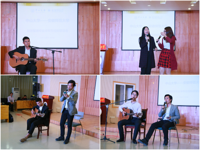 本科生校际联谊会。中山大学旅游管理与规划系主任左冰副教授、副主任刘逸博士、国旅学院党委副书记乔静等领导老师出席了联谊会,两校学生相间而坐,以更加轻松活泼的形式深入交流。两校2015级旅游管理专业的班长分别为对方佩戴上自己学校的校徽,象征着长江之滨的师大学子和珠江之畔的中大学子结成互信互助的朋友。随后,两校师生将精心准备的文艺节目一一呈现,国旅学院精心准备的茶艺节目《高山流水》博得满堂彩,一壶清茶用以招待远方来访的朋友;色情动漫