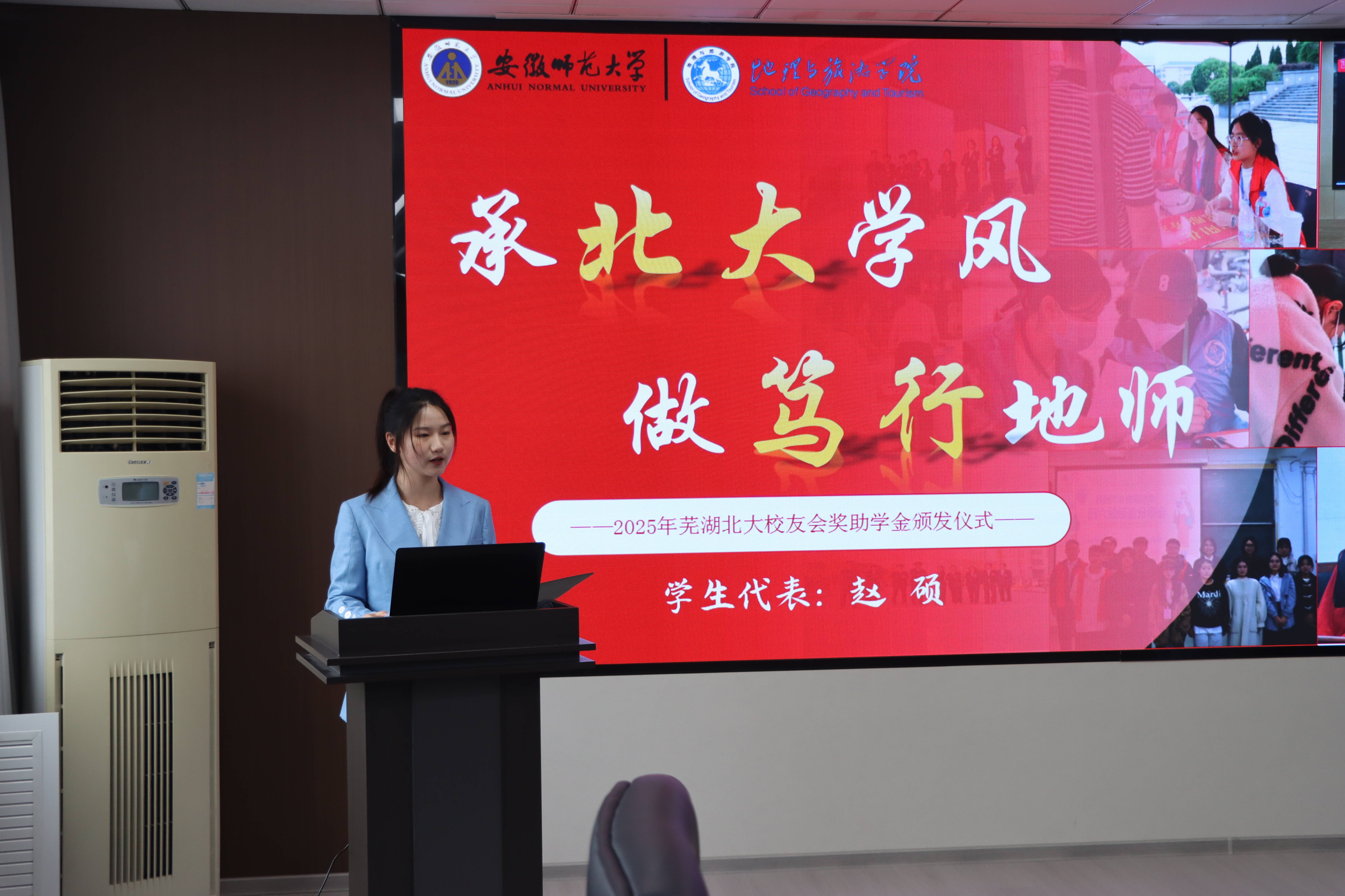 交流环节,“芜湖北大校友会”奖学金获奖代表,2022级地理科学(师范)专业赵硕以“我在师大地旅的故事”为题,从“学思践悟,做有深度的师大人”、“勤学笃行,做有厚度的地旅人”、“勇于担当,做有韧度的地理人”、“向阳花开,做有才干的地师人”四个专题,回顾了自己大学以来坚定初心、孜孜不倦、乐于奉献、勤于学习,在踏实进取中不断成长的蜕变之路。最后,以饱满热情表达了对北京大学芜湖校友会的感谢,以及对学校、学院的感激之情。“芜湖北大校友会”助学金获奖代表,2024级旅游管理专业胡博宇表示“我们接受资助,不仅是为了改善生活,更是为了积蓄力量,厚积薄发”,她提到滴水之恩,当涌泉相报,会把这份温暖化作动力来服务家乡、奉献社会、回报母校。