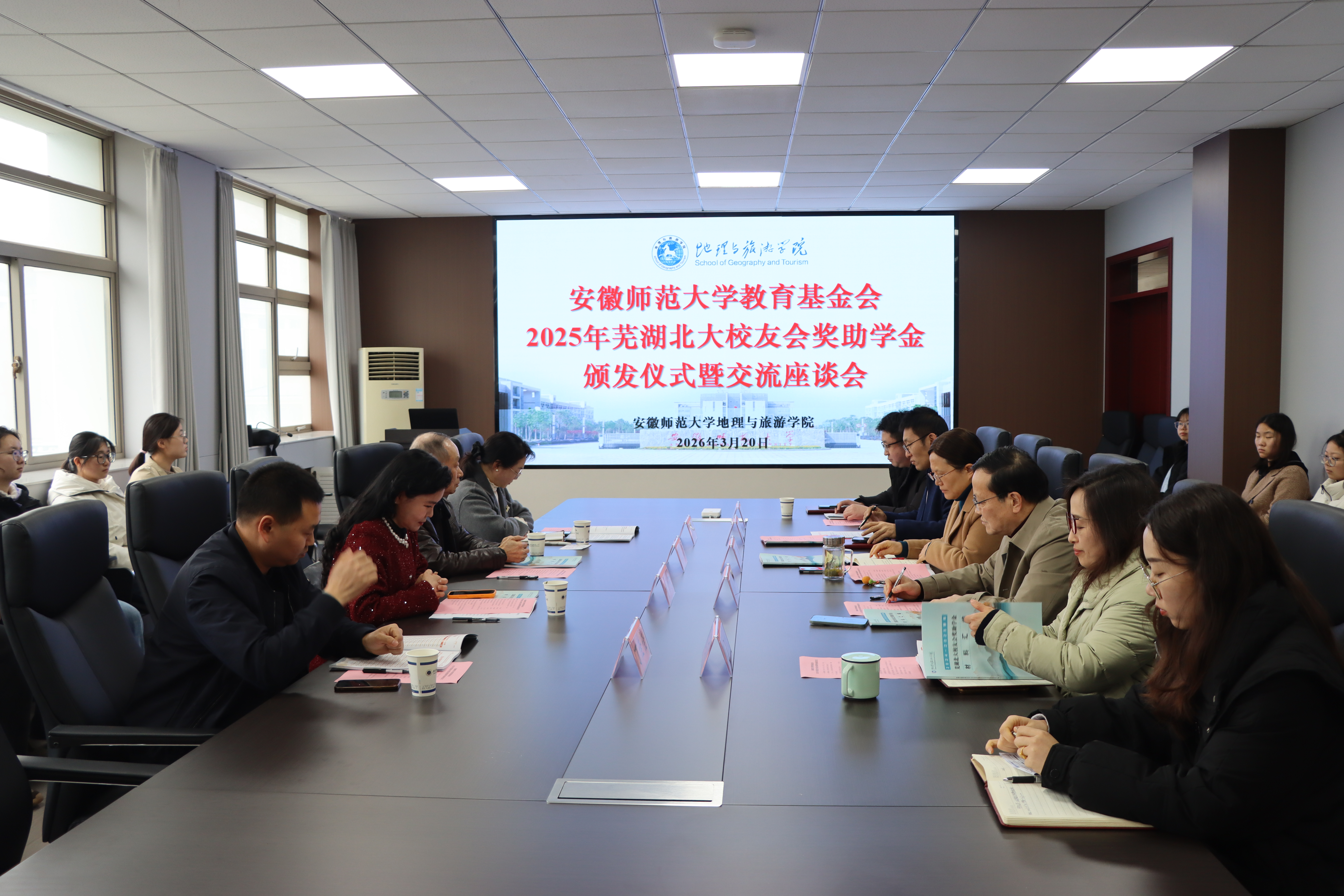 在学院行政楼三楼会议室举行2025年“芜湖北大校友会”奖助学金颁发仪式暨交流座谈会,北京大学芜湖校友会副会长周玉森,常务副会长童劭琼,副秘书长陶晓燕,芜湖传媒集团新视界媒体中心首席记者丁佳佳,校教育基金会副理事长余国升,学院院长方凤满,副院长孙鹏、汪文文以及色情动漫