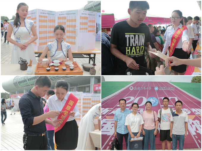 、新生防盗防骗安全预警手册、学生资助手册、校园地图、定制环保水杯等物品,为新生提供最全面、最温馨的报到服务。迎新现场,由国旅学院学生党员组成的“党员迎新服务示范岗”也展示了党员的优良精神面貌,他们耐心为新生及家长答疑解惑,提供茶水。国旅学院旅游管理专业的学生为大家奉上了精彩的茶艺表演,展现了国旅学院别样的文化特色。手续办理结束后,志愿者还引领新生及家长来到合影墙前拍照留念,让他们在新的“起跑线”上留下自己的笑脸,激励新生在新起点怀揣新梦想,不断奋斗、勇往直前。