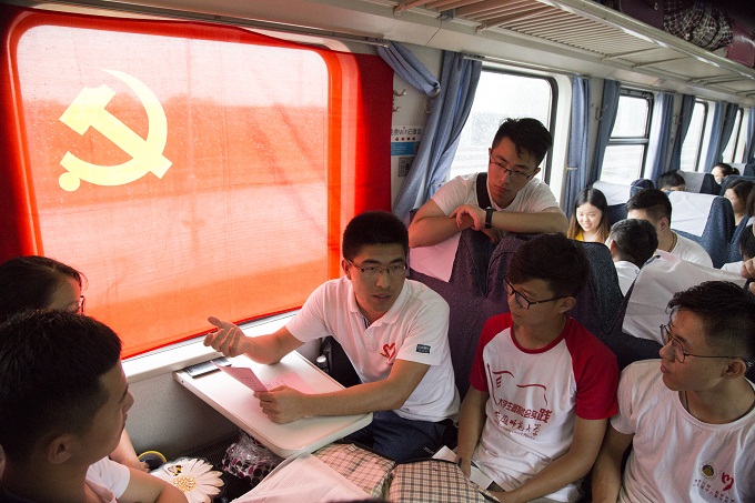 几乎在同一时间,在由安徽合肥开往四川达州的K1157次列车5号车厢里,国旅学院辅导员赵将老师的身边围坐着一群学生党员和积极分子,一面鲜红的党旗悬挂在车窗上,他正在给“情系川皖圆梦巴蜀”山区留守儿童支教团的队员们讲授一堂特别的党课,主题是“心怀家国梦想,拥抱奋斗青春”,而这一支团队也正式踏上了连续第10年赴川支教的征程。“家国梦想是泱泱华夏千百年来优秀青年不懈的追求与坚守,千百年来,无数仁人志士胸怀家国天下,为中华民族的生存发展作出了巨大的贡献和牺牲,以实际行动为我们诠释了家国情怀的内涵要求”,“青春因奋斗而精彩,有了梦想,青春才会闪光,有了奋斗,青春才会飞扬,有了拼搏,青春才会美丽。青春,需要奋斗!只要我们每一位青年大学生拥有奋斗的青春,未来的中国才能真正屹立在世界东方,走向复兴、创造辉煌!”赵将动情地鼓励着在场的同学们。