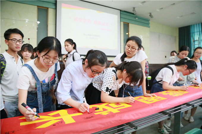 5月27日下午,工作人员在第一排座位拉起了“诚信还贷,感恩成长”的红色条幅,同学们纷纷在条幅上签名,表明自己履行承诺的决心。在活动过程中,工作人员积极宣传诚信活动主题,营造出了诚信为先的良好教育氛围。随着毕业季的来临,毕业生们也收到了校方发出的《一封致贷款毕业生的信》,校方以此来向各位应届毕业生表达感谢之情,感谢毕业生们自觉履行了还贷的承诺,并且顺利完成各自学业,将要前行在更远的道路上发展和完善自我,预祝毕业生实现更加远大的理想。