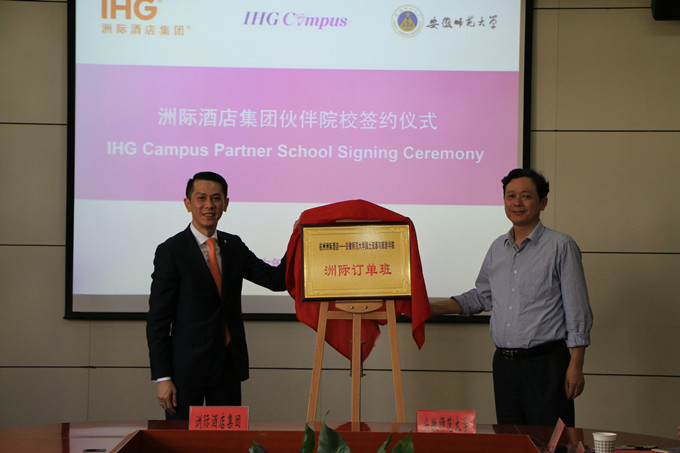 据悉,我校国旅学院长期以来高度重视应用型专业的联合培养及合作办学工作,与开元集团等国内外知名企业集团保持长期良好合作关系,坚持以“国际化、复合型、应用性”为特色,以“学校教育+行业培养”双向教育为抓手,积极开展“教学+实习+实践+就业”四基地建设,成果斐然。据了解,洲际酒店集团(IHG)成立于1777年,是目前全球最大及网络分布最广的专业酒店管理集团,在全球100多个国家和地区拥有 5,000 多家酒店和近 74.4 万间客房,拥有洲际、皇冠假日、假日、智选假日、英迪格、华邑酒店等多个国际知名酒店品牌和超过60年国际酒店管理经验,是世界上客房拥有量最大、跨国经营范围最广、在中国接管酒店最多的超级酒店集团,其业务涉及中国大陆25个省、区、市。值得一提的是,在2016杭州二十国集团工商峰会(B20)筹办期间,我校国旅学子在B20峰会主会场(杭州国际会议中心暨杭州洲际酒店)全力投入相关工作,充分展示了师大学子精湛的专业素养和良好的精神风貌,学校因此被授予二十国集团工商峰会(B20)服务保障优秀合作院校称号。