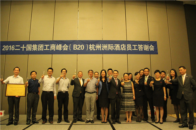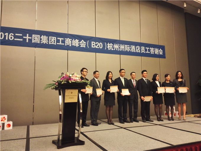 本网讯(国旅学院)9月19日下午,2016杭州二十国集团工商峰会(B20)答谢会在杭州洲际酒店新闻发布厅举行,我校被授予二十国集团工商峰会(B20)服务保障优秀合作院校称号,校党委常委、副校长朱家存代表我校受邀参会并接受牌匾,杭州市钱江新城投资集团党委书记、董事长朱云夫,杭州国际会议中心总经理陈晓,洲际集团大中华区东区运营总监Daniel Arbenz,杭州洲际酒店总经理Frankson Lee,B20保障合作单位、院校领导等出席大会。