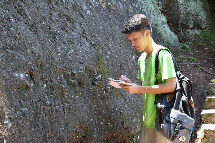 上午9点,团队来到丹霞博物馆,在艺术馆馆长的带领下参观了丹霞艺术馆,并于与队员们亲切交谈,介绍了很多关于丹霞山的文化知识。团队离开博物馆后向科考3、4号线路出发,从阳元石售票处一路向北行进,经过晒布崖,到达细美寨,攀爬陡峻的九天梯,队员们拉着铁栏杆和铁链相互扶持上山。经玄机台、风车岩,团队顺路而下,睹晒布岩风光,经过通泰桥、云门、狮子岩、混元洞,看海豹石,在混元洞内采集岩石样本,探究混元洞的形成原因。下午4点,团队回到阳元石票站,前往水上丹霞,与“水上丹霞”景点的总经理洪先生热切交谈,洪先生充当导游,随团队一起游览锦江,解说锦江两岸的景色。在喜头村下船进行的简单考察之后,团队乘船返回,结束了一天的科考行程。