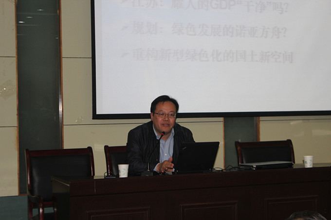 黄教授首先从认知绿色发展、从富饶的贫困到不能忽视的绿色鸿沟、江苏耀人的GDP是否干净、规划是绿色发展的诺亚方舟以及重构新型绿色化的国土新空间五个方面对生态文明、绿色发展作出了具体概述。然后,他又对当今社会中地方政府与普通民众的关系作出了阐释,提出了让利于民的理念,用逻辑架构的方法分析人的生存与幸福、水资源、土地资源、山林生态文化传统之间的依存互动关系。最后,黄教授全面阐述了我国土地资源开发和利用中的现状及存在的问题,并探讨了解决的对策。